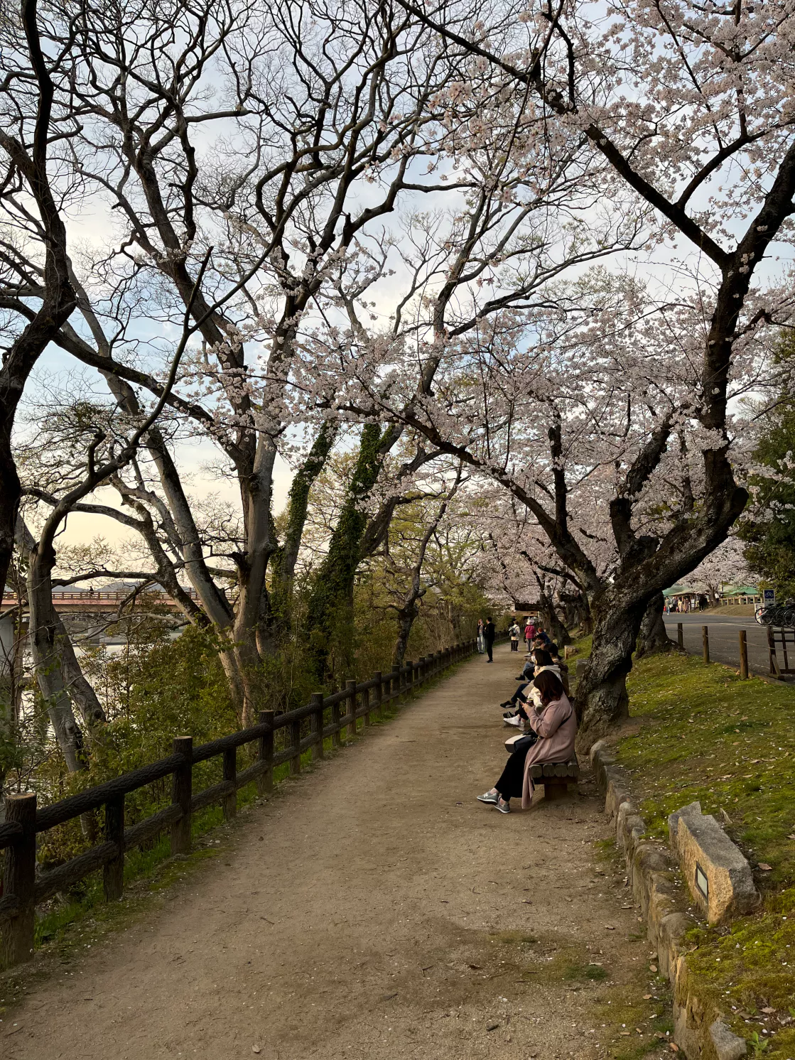 앉아서 강가를 바라보며 벚꽃 아래에서 있기 좋아 보이네요.