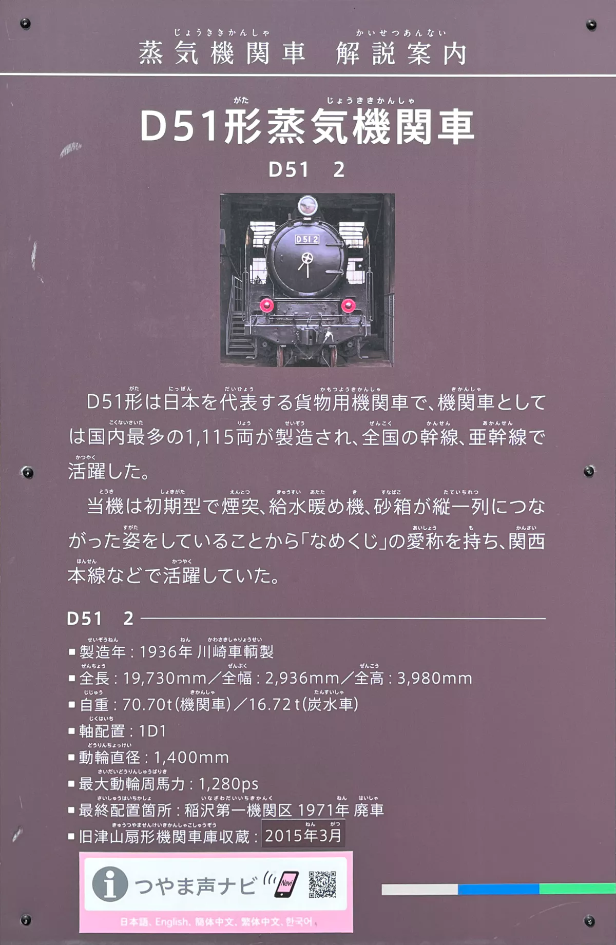 D51형은 일본을 대표하는 화물용 기관차로, 기관차로서는 일본 국내 최대인 1,115량이 제조되어 전국의 간선 및 아간선에서 활약했습니다.
