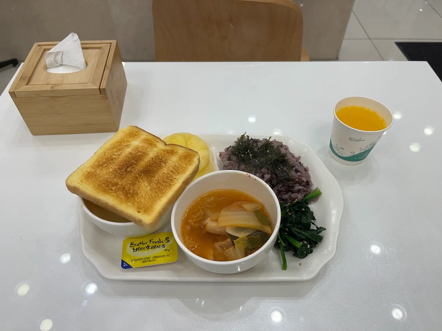 아침에 다양히 먹는 편이 아니라 빵과 스프, 밥, 파인애플, 김자반, 밥, 오렌지주스 정도를 적당히 담아와서 먹었습니다.