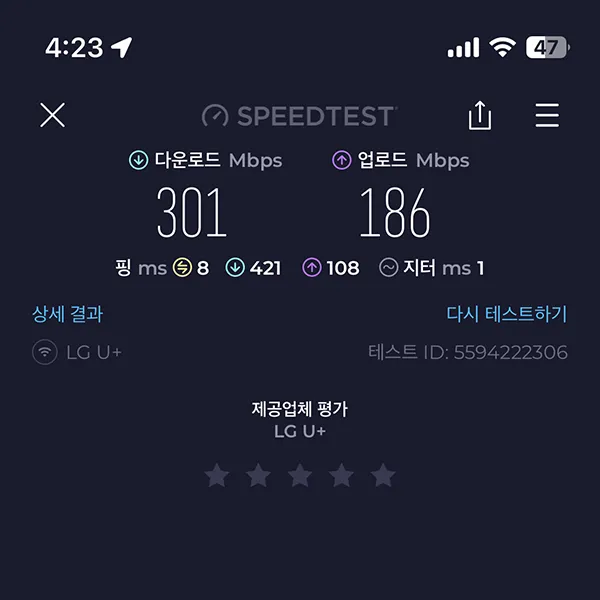 다만, 다운로드에 비해 업로드 속도가 오락가락하는 편이라 조금 애매한 점도 있는 것 같습니다.