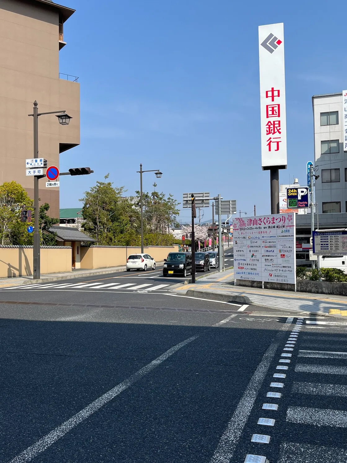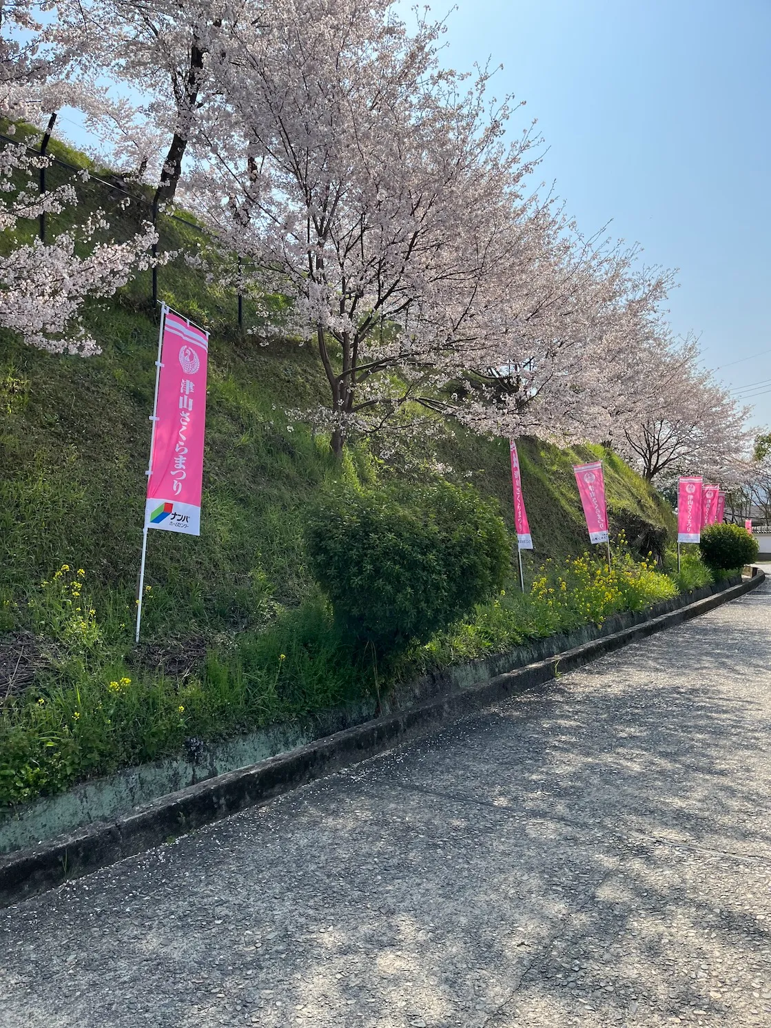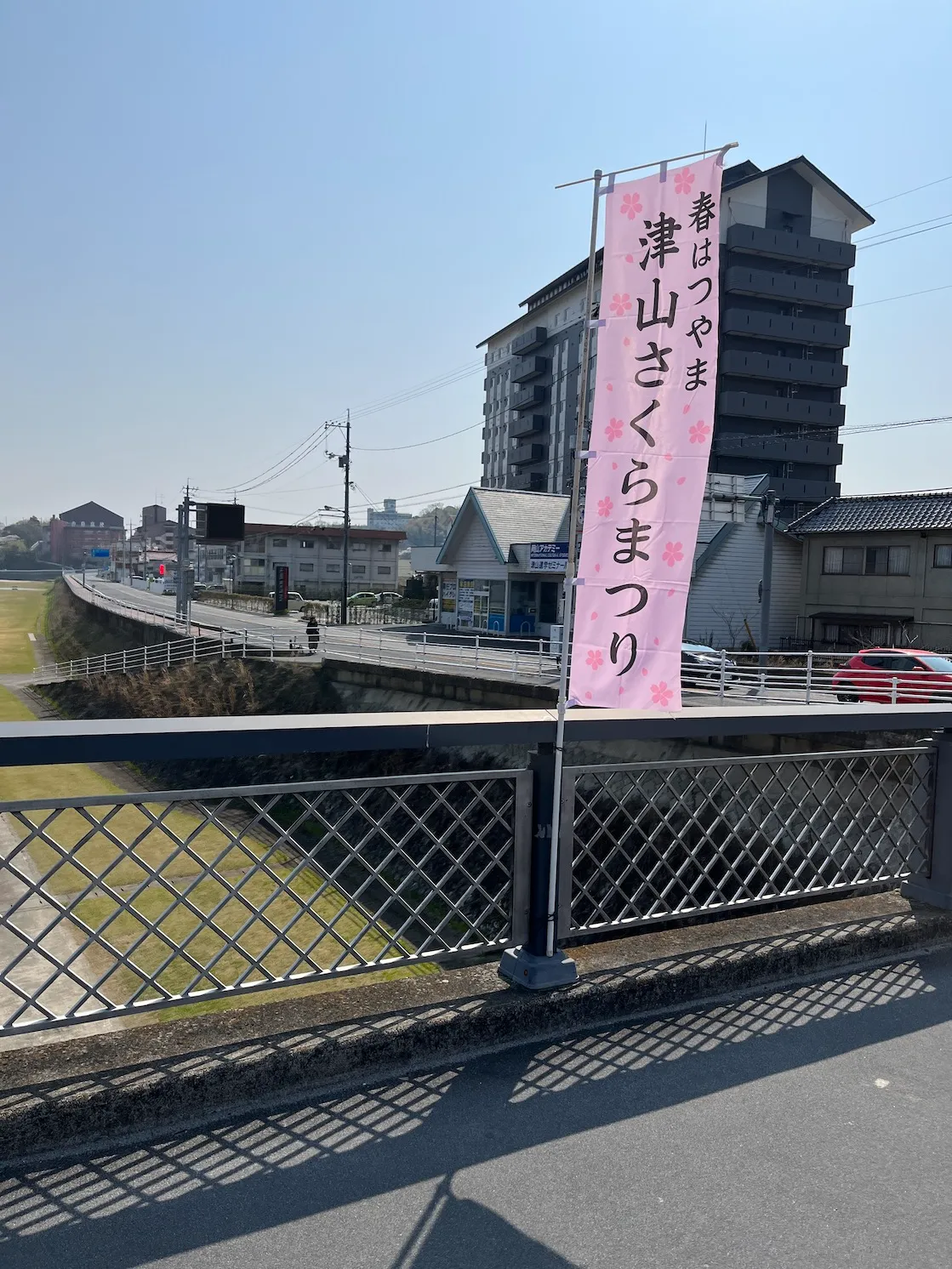 길에 '쓰야마 벚꽃 축제'라는 깃발이 줄지어 걸려 있네요.