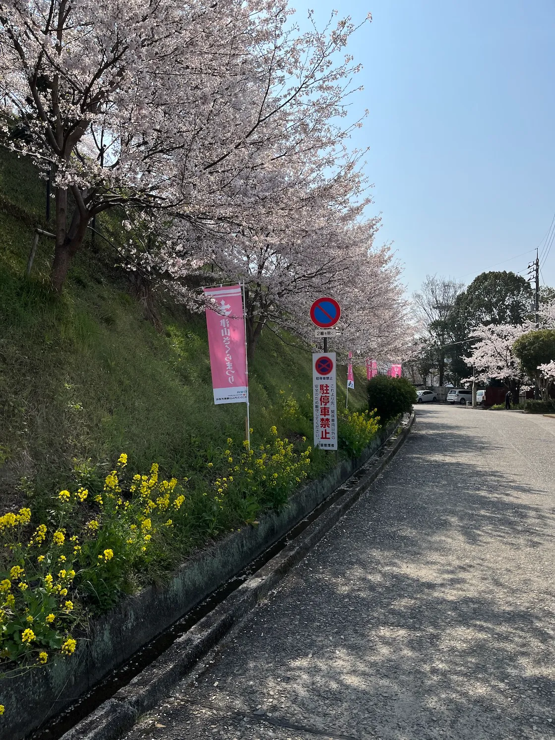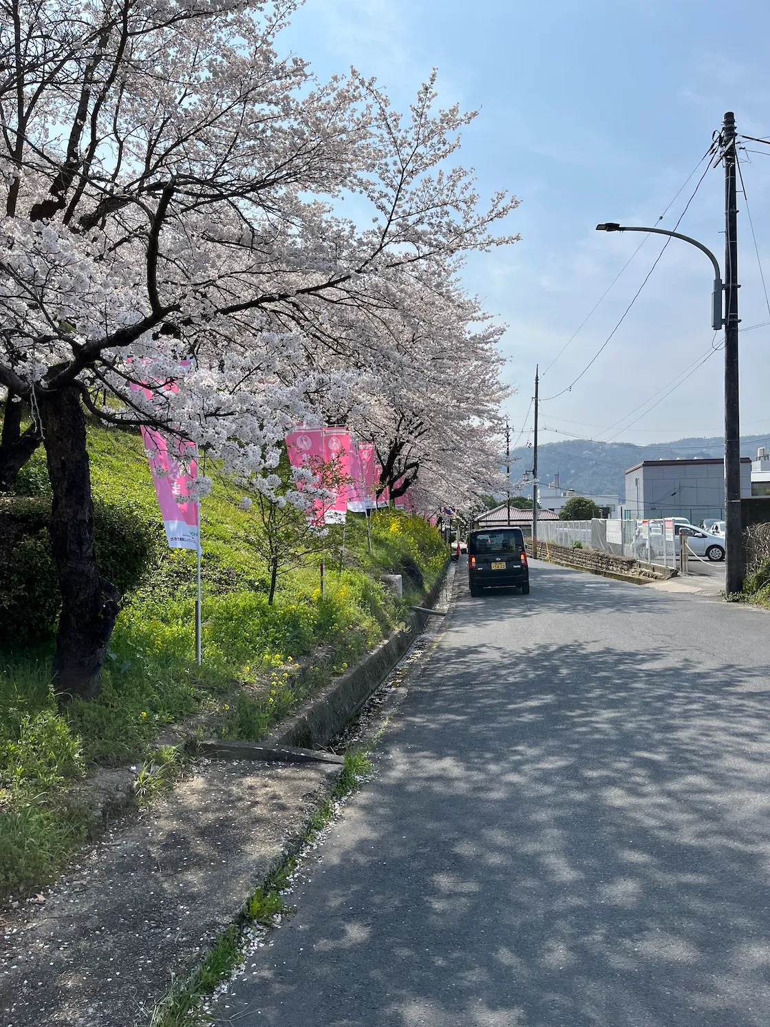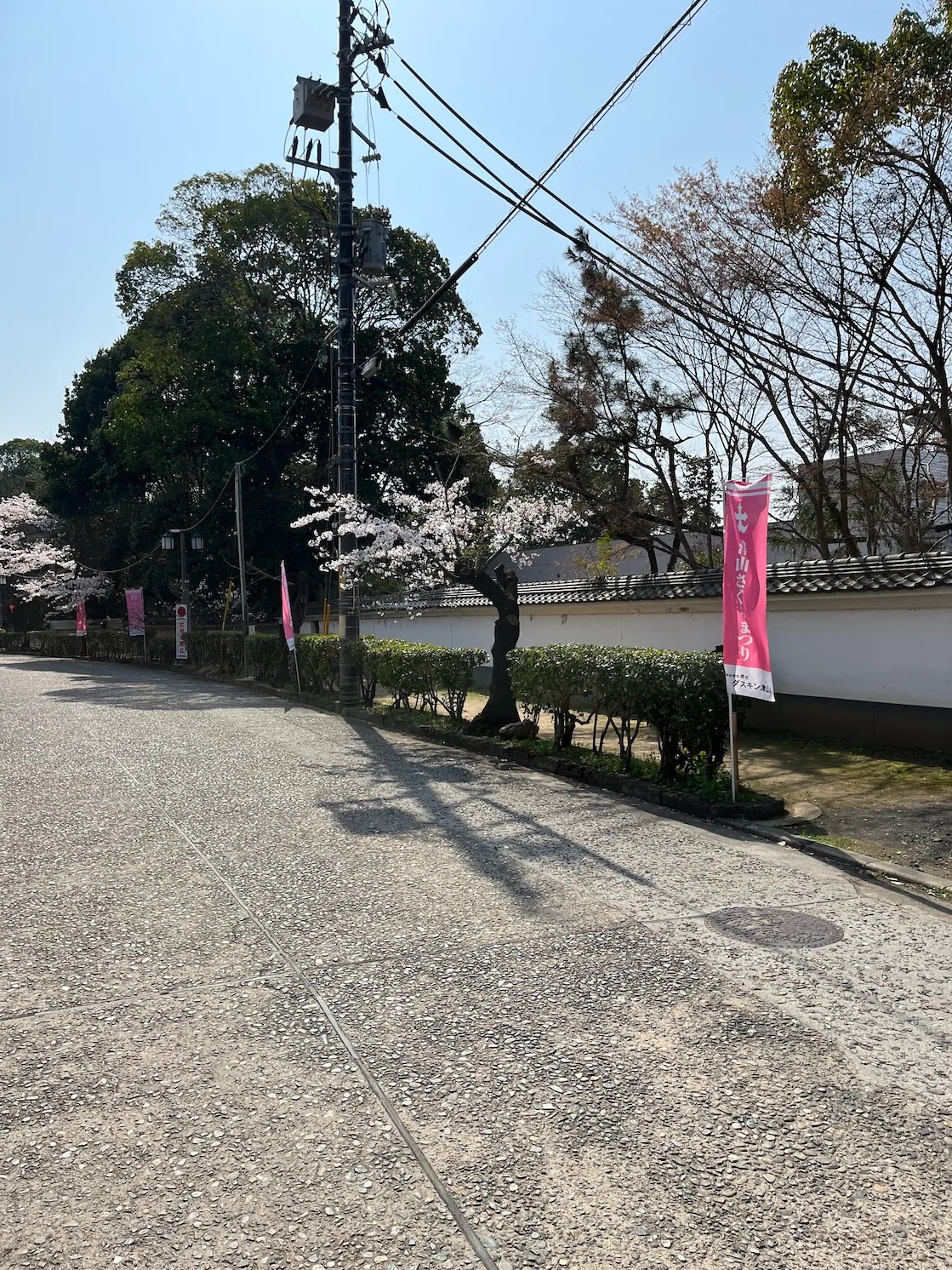 길에 '쓰야마 벚꽃 축제'라는 깃발이 줄지어 걸려 있네요.