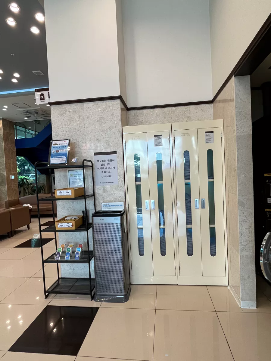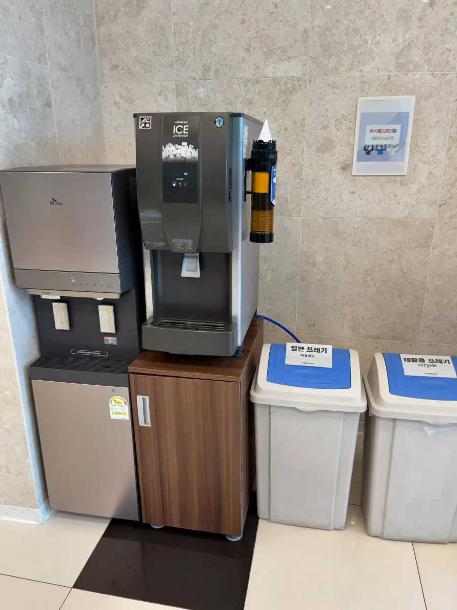 일회용품은 따로 제공되지 않고 1층에 있는 자판기에서 사서 쓰거나 옆의 세븐일레븐에서 사서 써도 될 것 같습니다.
