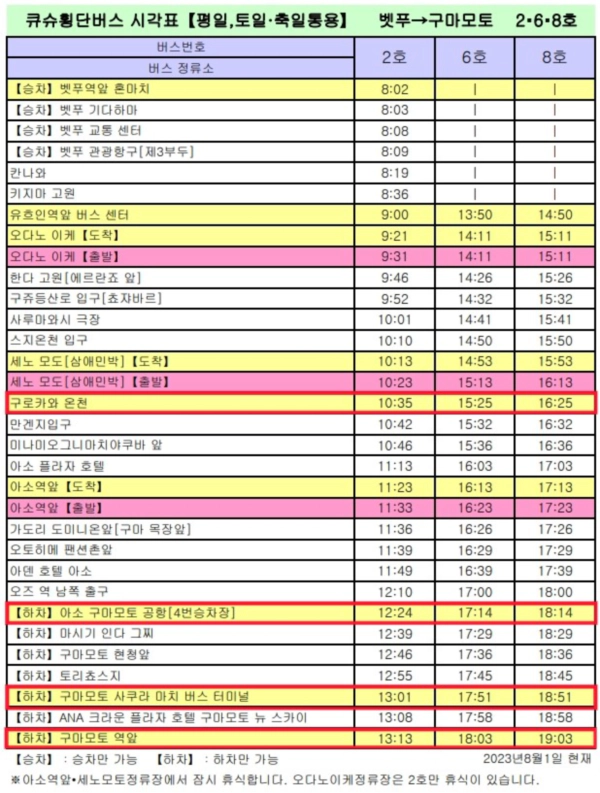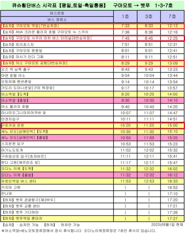 | 구마모토역 앞 | 07:33 | 08:33 | 12:13 |