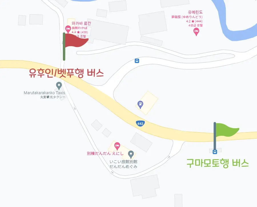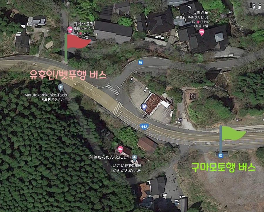 붉은 깃발로 된 '유후인/벳푸행 버스' 정류장이 후쿠오카/구마모토에서 쿠로카와 온천으로 오면 내리는 정류장이에요!