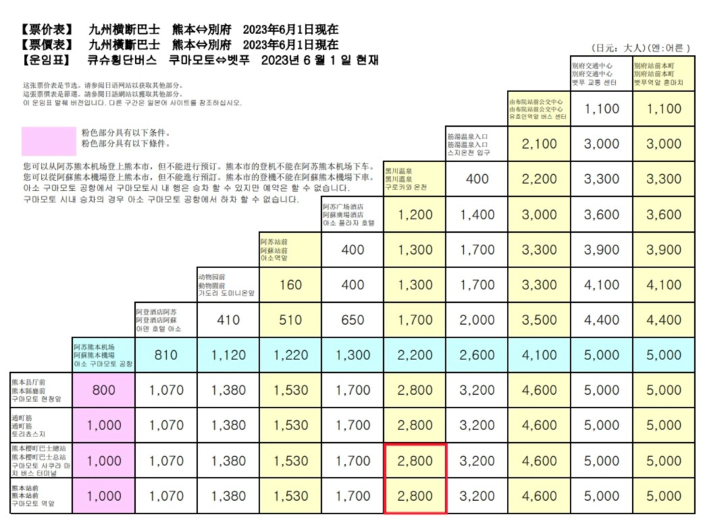버스요금은 구마모토 시내에서 쿠로카와 온천까지 편도 2,800엔이에요!