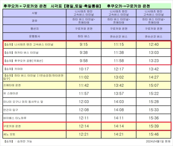 시간표 및 소요시간: 후쿠오카 시내 → 쿠로카와 온천