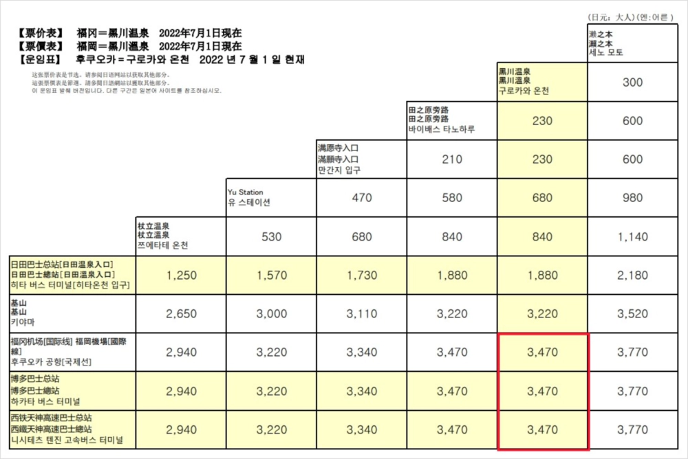 버스요금은 후쿠오카 시내에서 쿠로카와 온천까지 편도 3,470엔이에요!