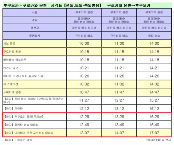 | 쿠로카와 온천 | 10:35 | 15:25 | 16:25 |