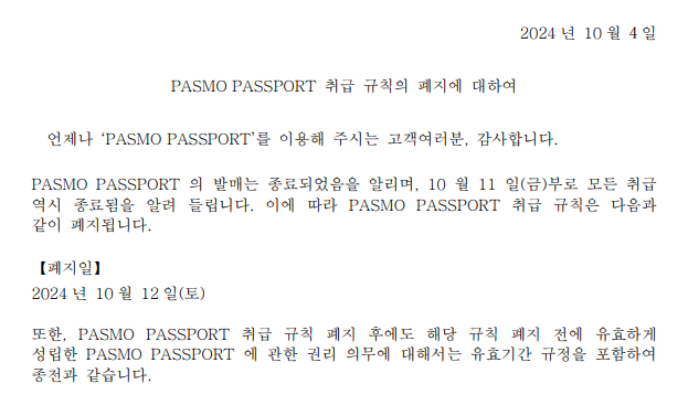 파스모 패스포트는 2024년 10월 11일을 기점으로 단종되었어요!