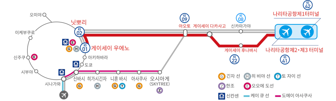 (나리타공항 출발) - (중간 정차역 생략) - 게이세이타카사고 - 아오토 - 닛포리 - 게이세이우에노