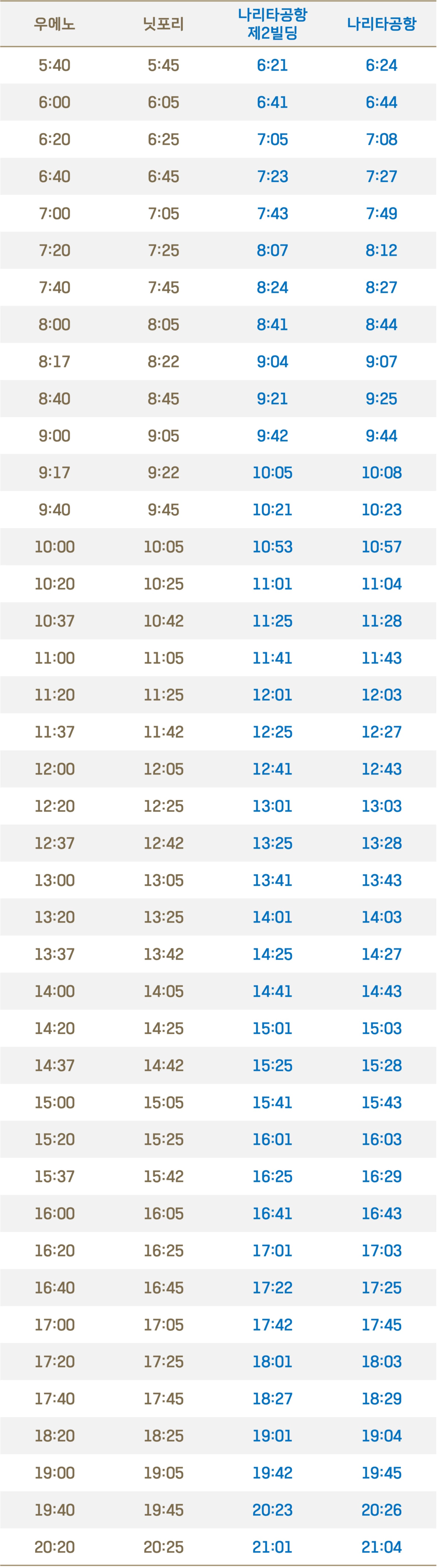 우에노/닛포리 출발-나리타공항행(평일)