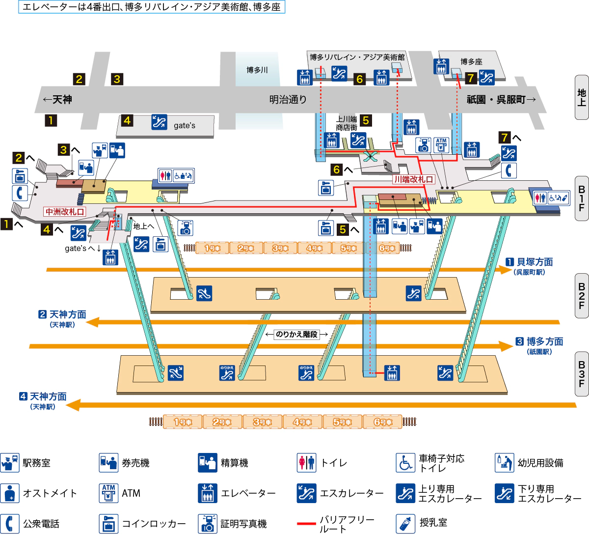 엘리베이터는 4번 출구, 하카타 리버레인 아시아 미술관, 하카타자에 위치
