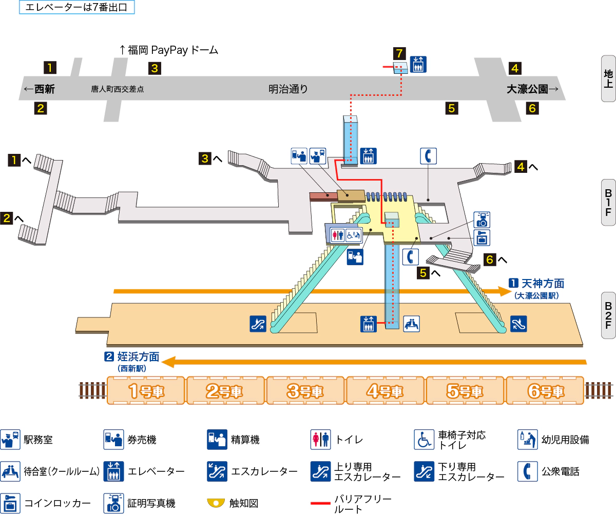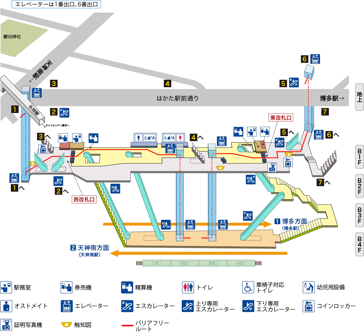 엘리베이터는 11번 출구, 13번 출구, 후쿠오카 PARCO 신관에 위치