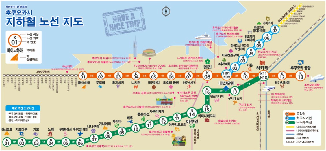 한국인들이 해외여행으로 많이 찾는 도시인 후쿠오카! 지하철과 버스를 주로 이용해서 돌아다니는데 그 중 지하철에 대해서 이런저런 정보를 정리해봤어요! 첫차와 막차시간, 역에 코인로커가 어떤 사이즈로 몇 개가 있는지, ATM과 엘리베이터는 있는지 등을 정리했어요! 정리한 내용 외에 자세한 내용은 아래 '후쿠오카시 지하철' 홈페이지를 참고하세요!