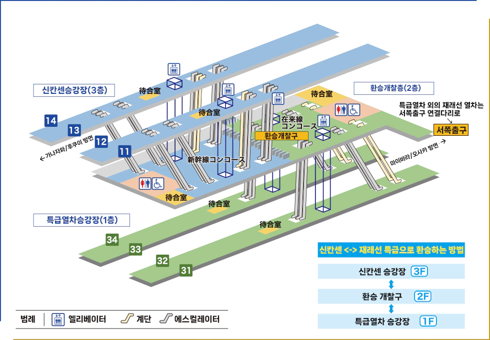 신칸센 승강장은 3층, 환승개찰구는 2층, 특급열차 승강장은 1층에 있어요!