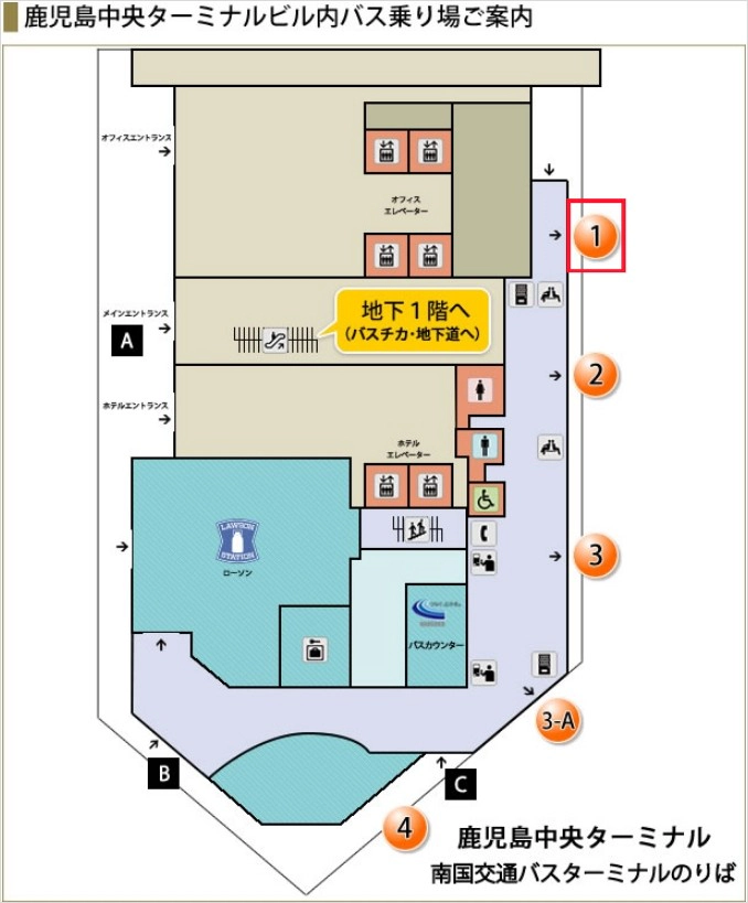 가고시마추오역 앞에 있는 버스터미널(1층)의 1번 승강장에서 타면 됩니다!