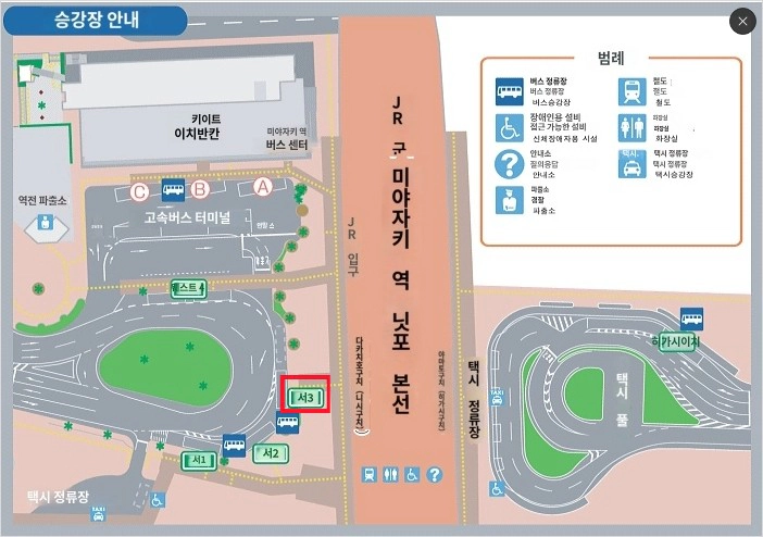 미야자키공항으로 가는 버스는 서3(西3) 승강장에서 타면 됩니다!