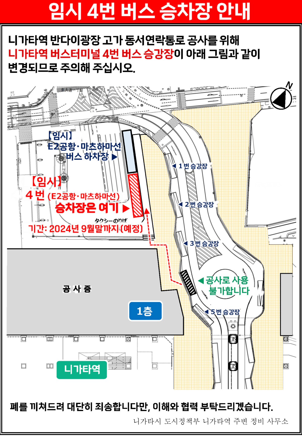2024년 3월 31일에 니가타역 버스 터미널이 개업하였지만 남은 공사가 있어 당분간 노선버스의 정류장 위치는 임시 정류장 위치를 참고해주세요!
