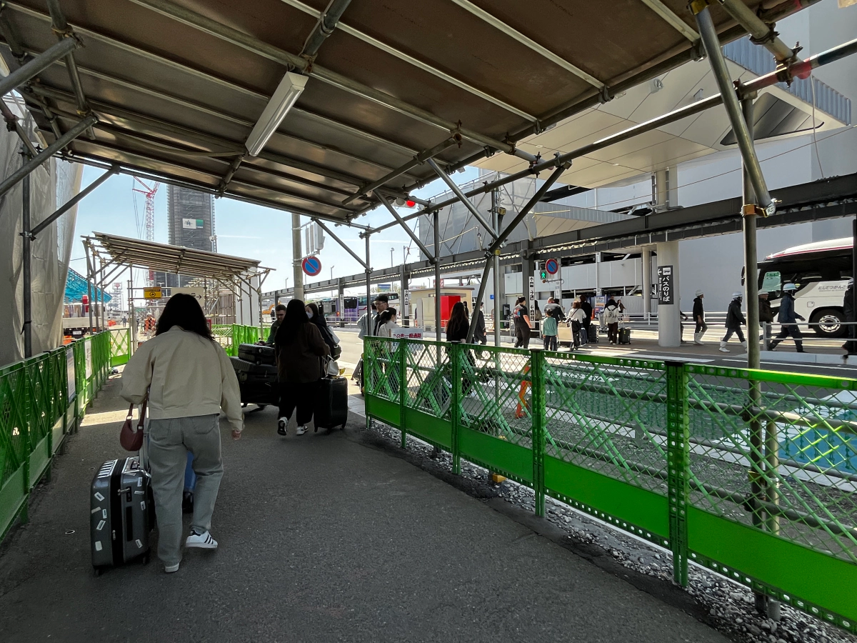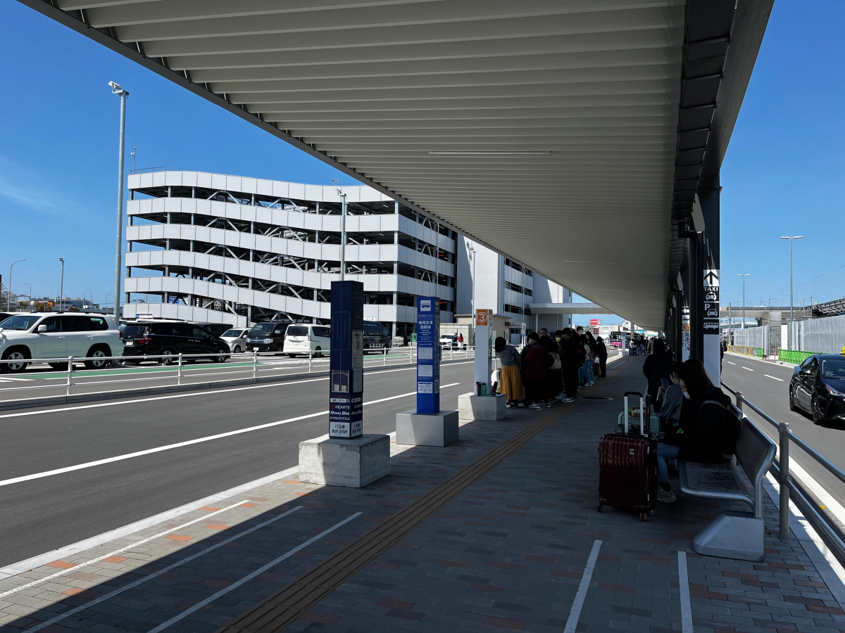 저 뒤로는 유후인/다자이후 등으로 가는 버스, 맨 뒤에는 국내선으로 가는 셔틀버스를 타는 사람들이 있어요.