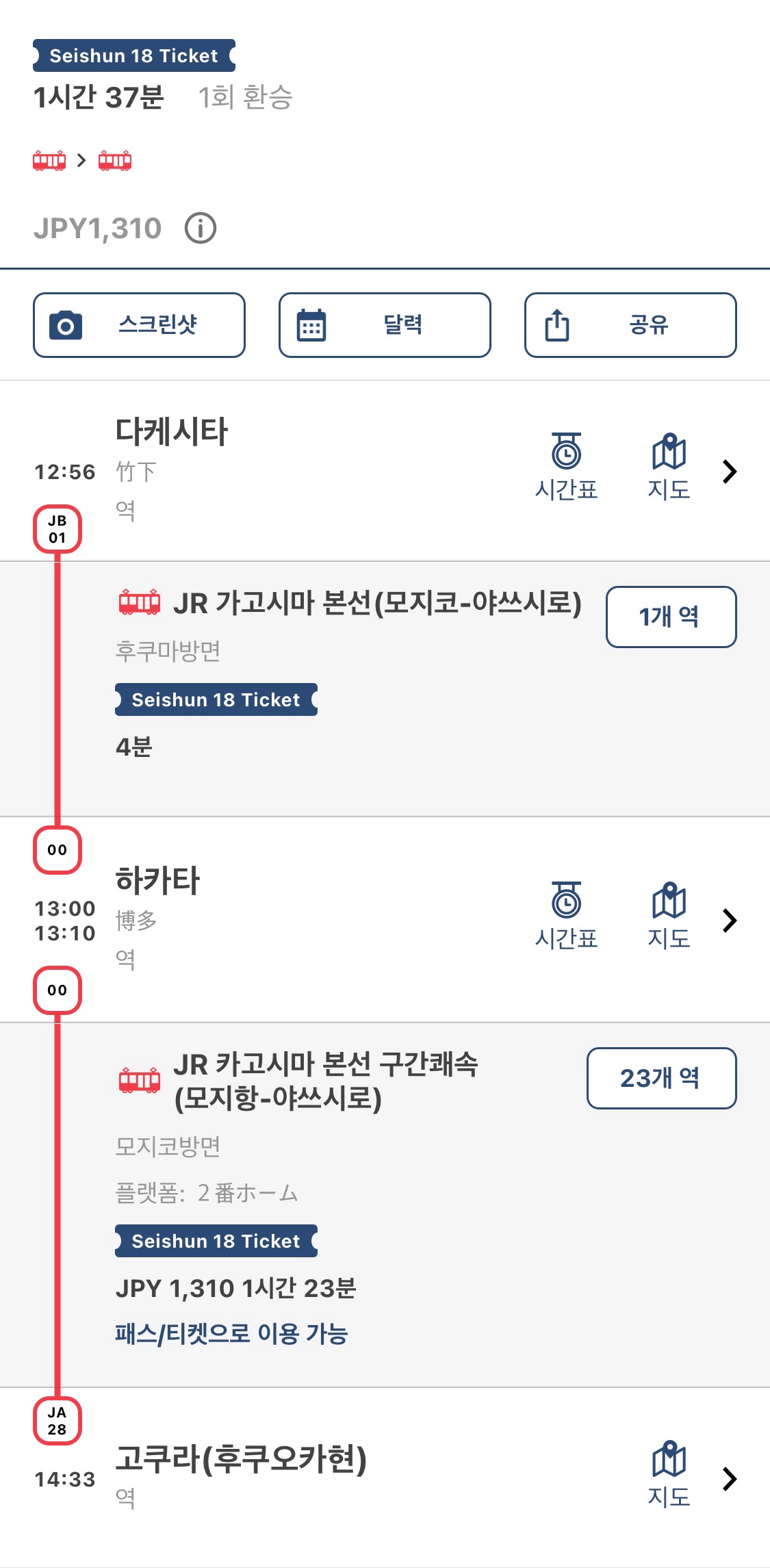 다케시타역에서 고쿠라역으로 바로 가는 열차는 현재 시간에는 보이질 않아서 하카타역에서 환승을 해야 하네요.