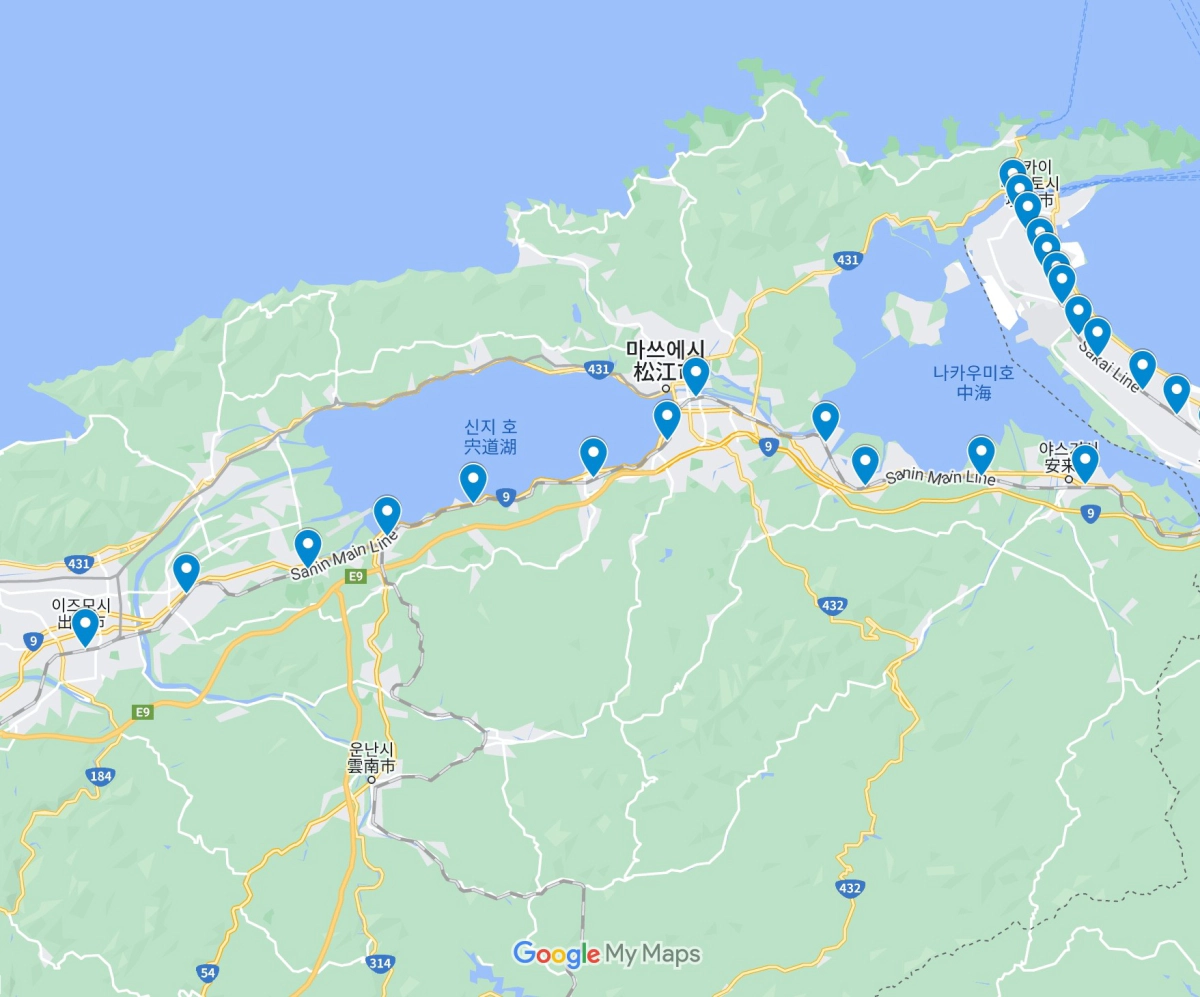 (산인본선의 서쪽 구간은 야마구치현, 동쪽 구간은 효고현과 교토부에 속해 있지만 그래도 이번에는 산인본선 구간을 정리하려고 한 것이라 역이 위치한 지역은 고려하지 않고 정리했어요!)