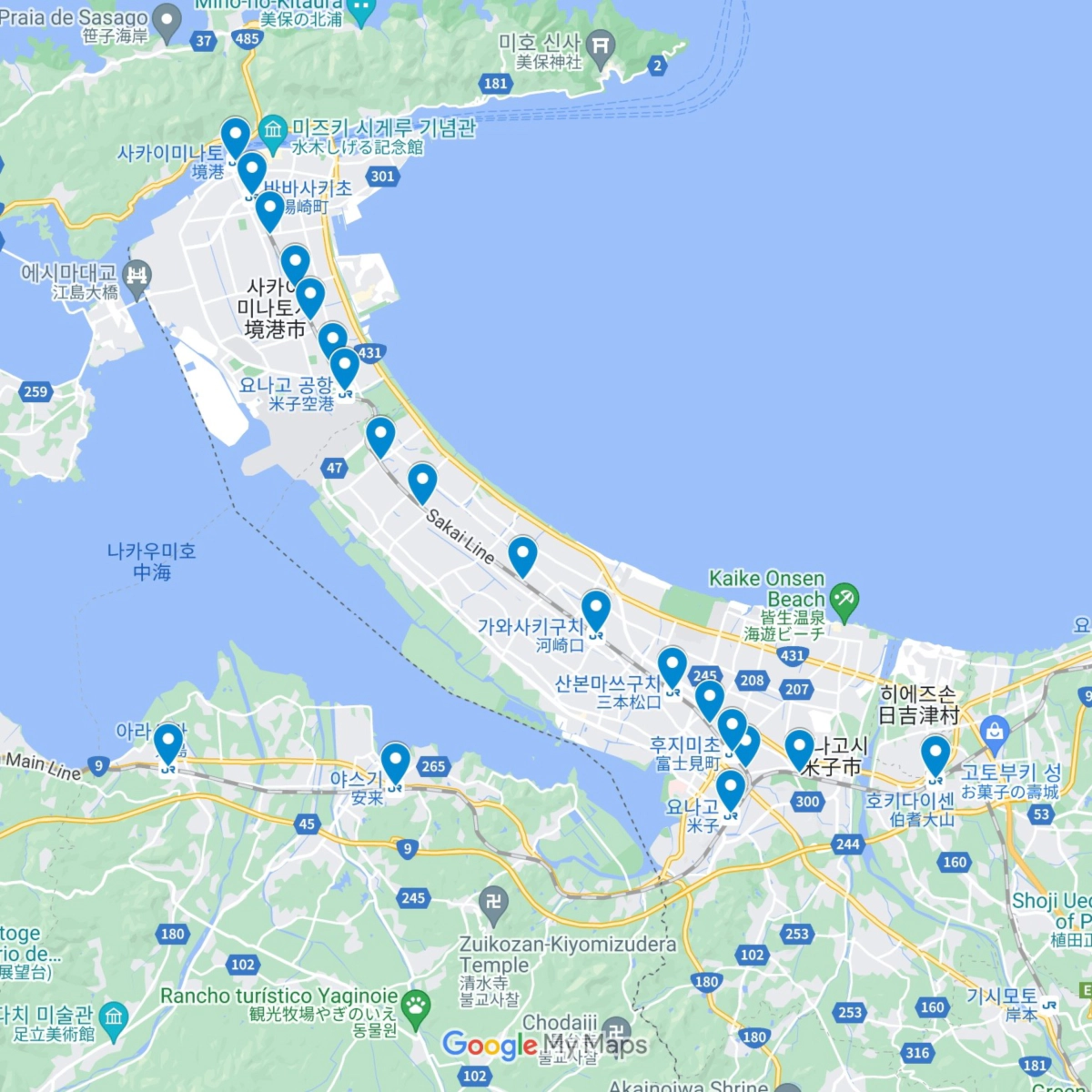 바쿠로마치역, 후지미초역, 고토역, 산본마쓰구치역, 가와사키구치역, 유미가하마역, 와다하마역, 오시노즈초역, 요나고 공항역, 나카하마역, 다카마쓰초역, 아마리코역, 아가리미치역, 바바사키초역, 사카이미나토역