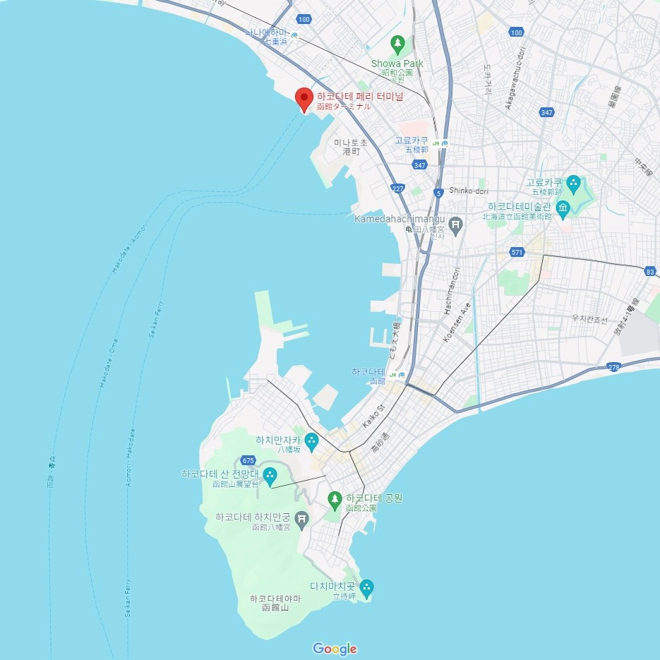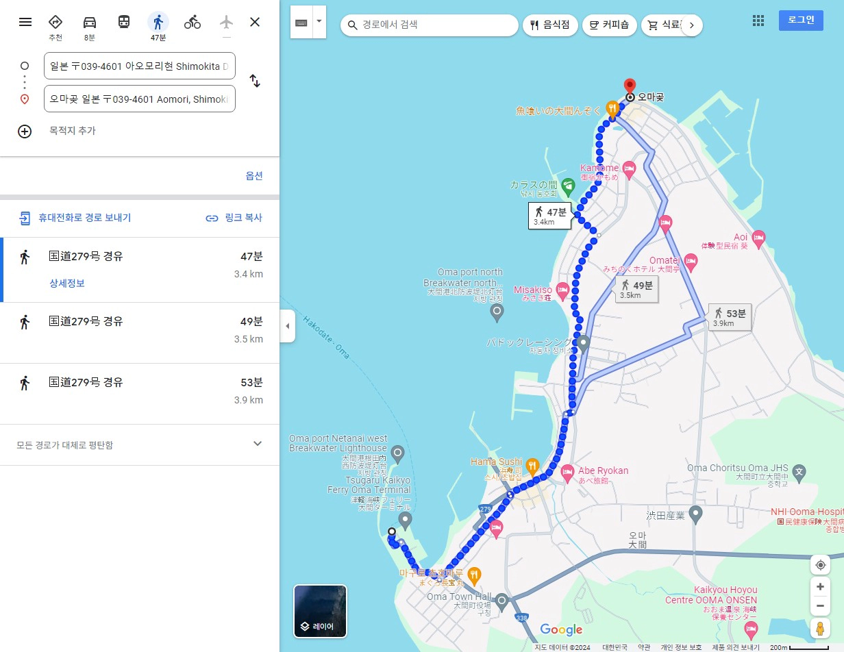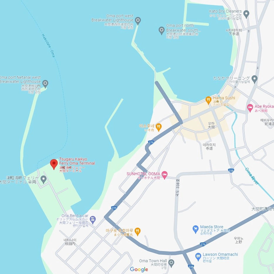 '하코다테 페리 터미널~오마 페리 터미널' 노선의 '쓰가루해협페리'를 타고 '오마 페리 터미널'에 내려서 편도 약 50분(3.4km)을 걸어가는게 최적의 동선으로 보여요.