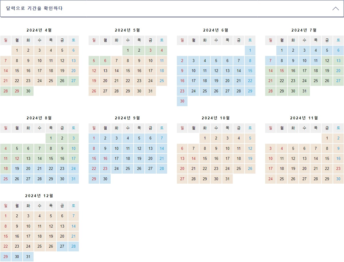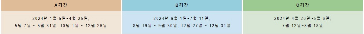 아래의 달력을 참고해서 기간에 맞는 요금을 확인하시면 될 것 같아요.