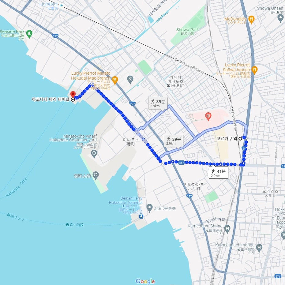 고료카쿠역~하코다테 페리 터미널 사이는 걸어서는 약 40분(2.9km) 거리라서 버스를 이용하는 방법을 추천드려요!