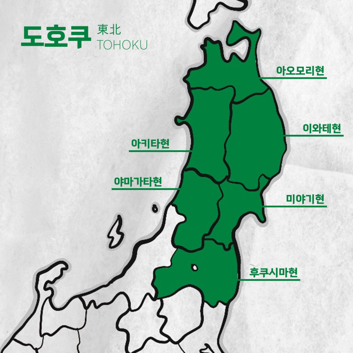 아오모리현/이와테현/아키타현/미야기현/야마가타현/후쿠시마현의 6개 현을 묶어서 도호쿠 지방이라고 해요.