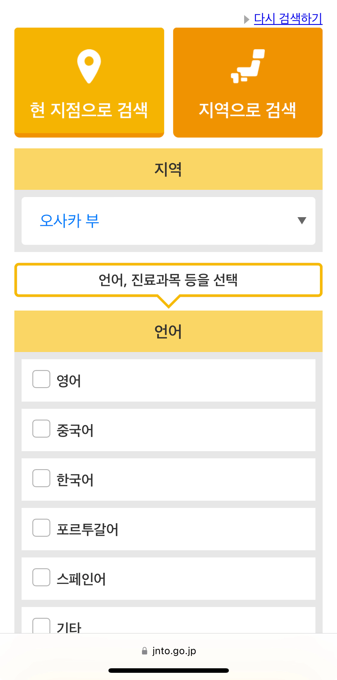 지역을 선택했다면 언어와 진료과를 선택하는 단계에요!