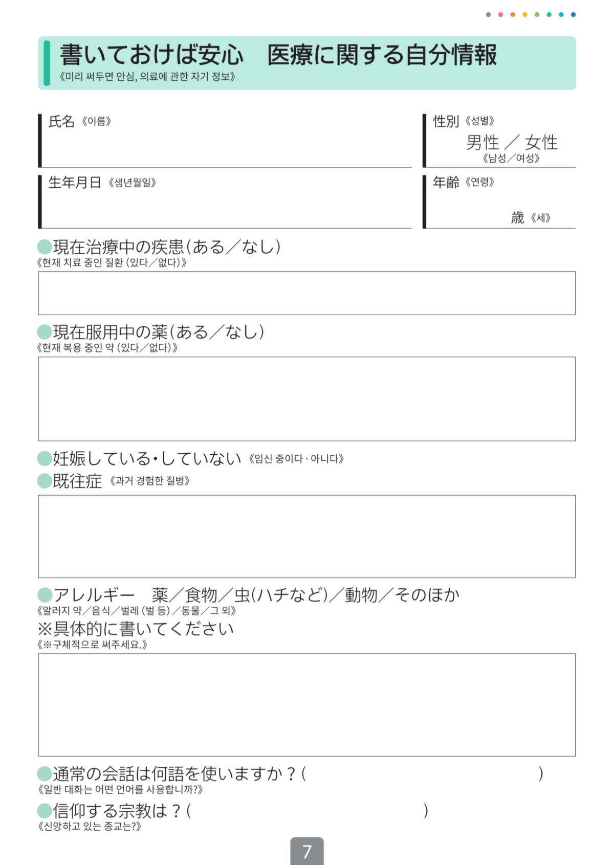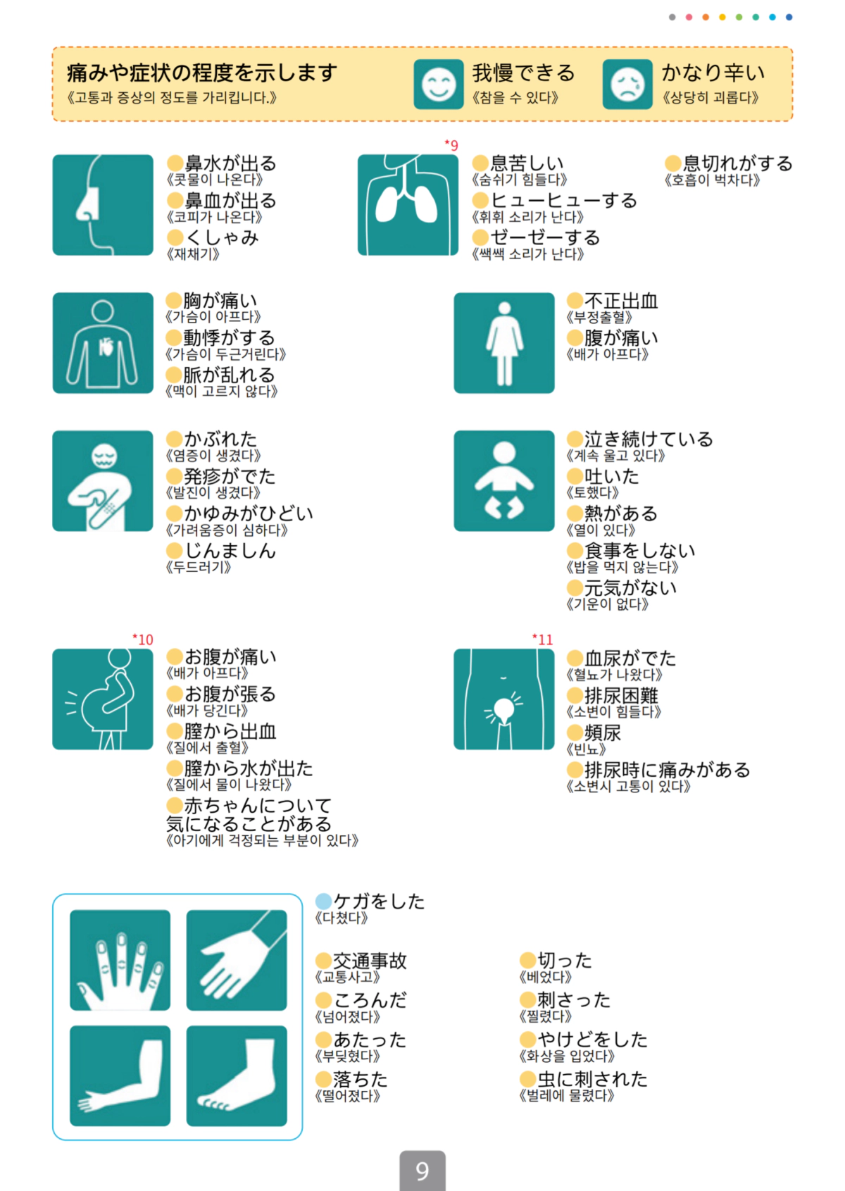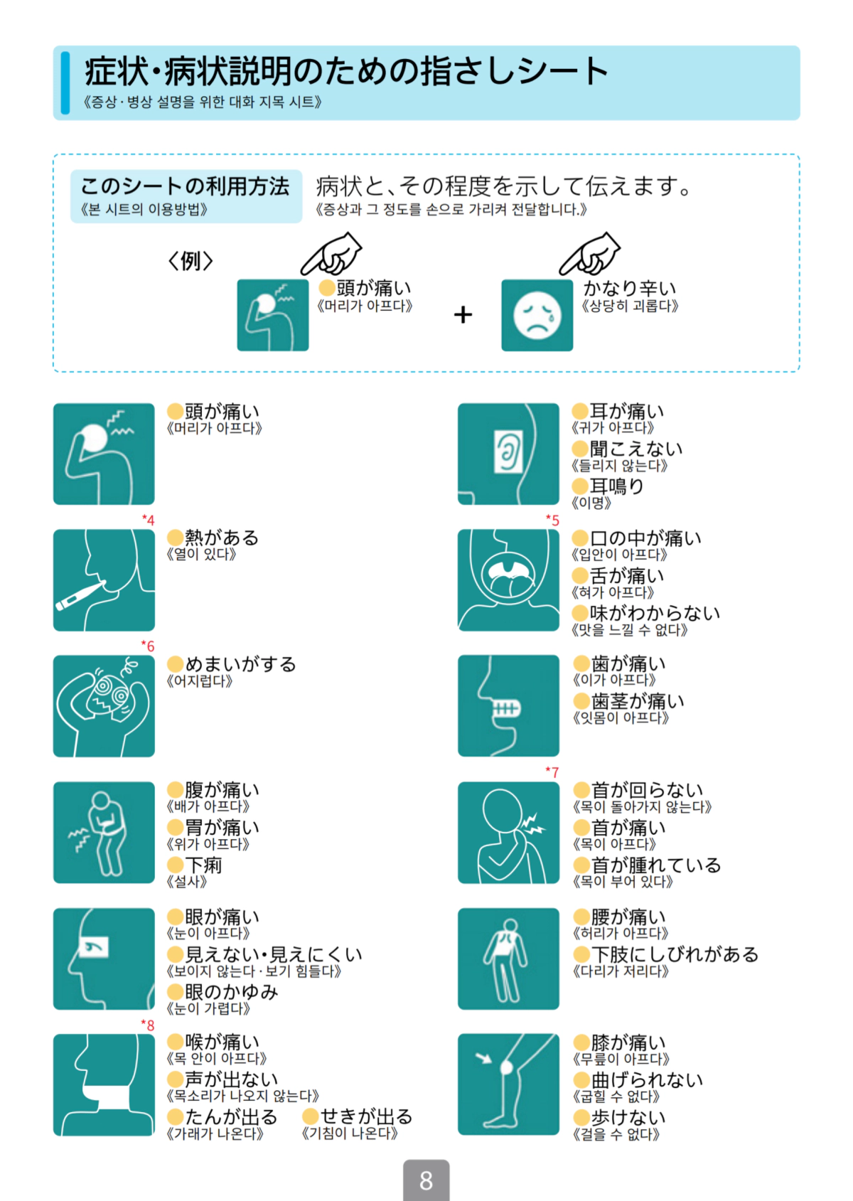한국어가 가능한 병원을 간다고 해도, 완벽하지 않을 수 있고 그 외에도 현재 있는 지역이 한국어 가능한 병원이 없어서 주변 병원 아무 곳이나 방문해야 하는 상황이라면 본인의 증상을 설명하기 위해서 일본어를 사용할 수 있어야 하겠지만 평소에 안 쓰던 일본어가 갑자기 술술 나올리는 없기에 아픈 증상에 대해 손으로 짚으면서 설명할 수 있는 '대화 지목 시트'라는 것을 제공하고 있어요!