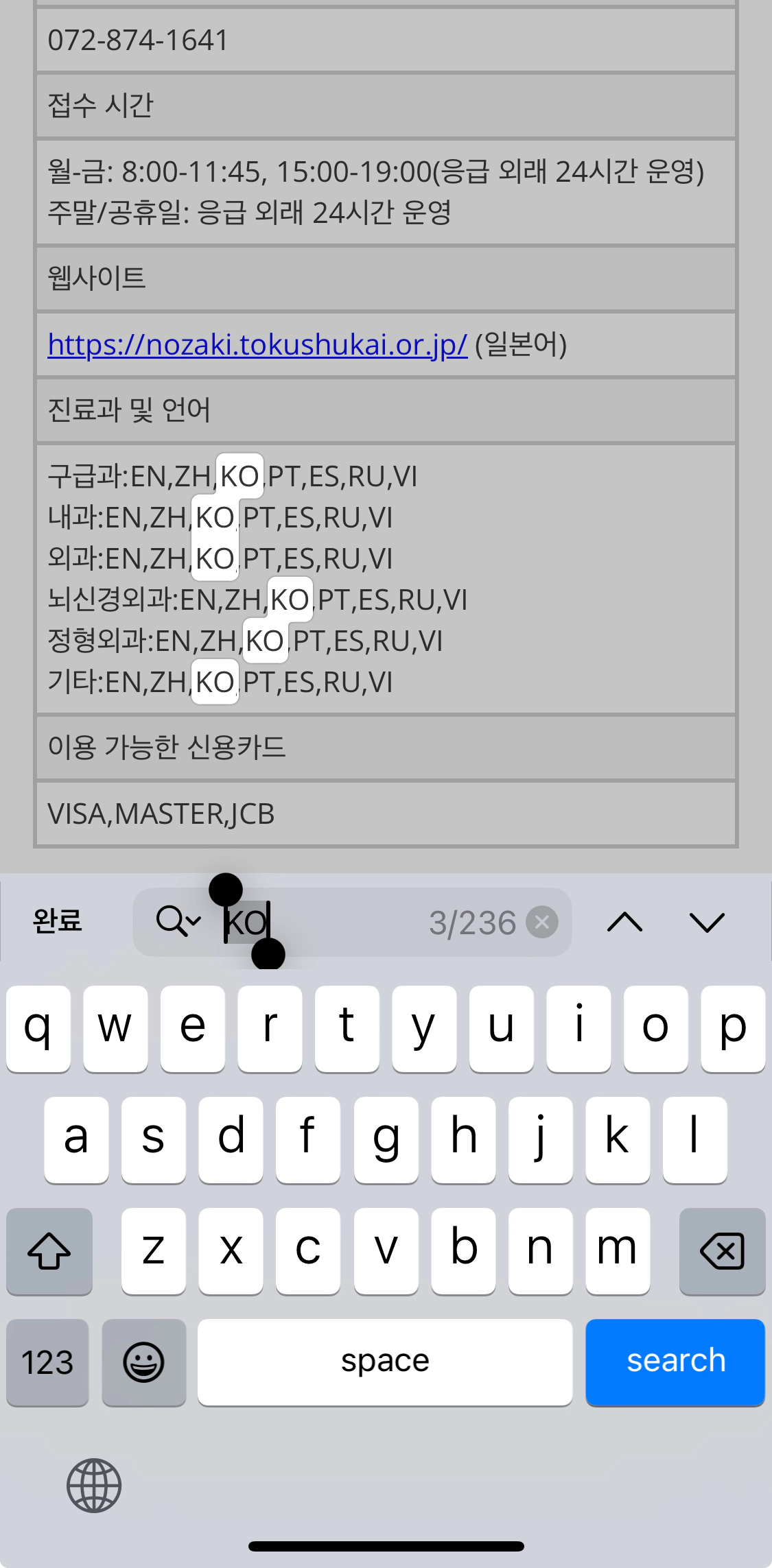 여행 중 병원에 가는 일이라면 갑작스런 일이기에 비용에 대해 대비가 되어있지 않을 수 있으니 현재 소지한 카드 브랜드(VISA/마스터 등)를 선택하여 해당 카드를 사용할 수 있는 병원을 찾는 것도 가능해요!