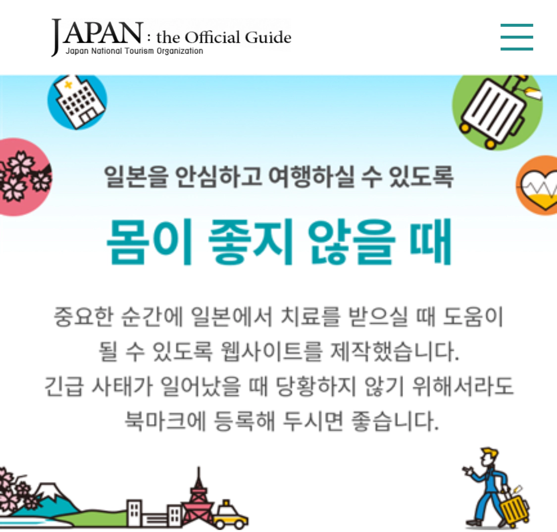 JNTO: 일본을 안심하고 여행하실 수 있도록 몸이 좋지 않을 때 도움이 되는 가이드