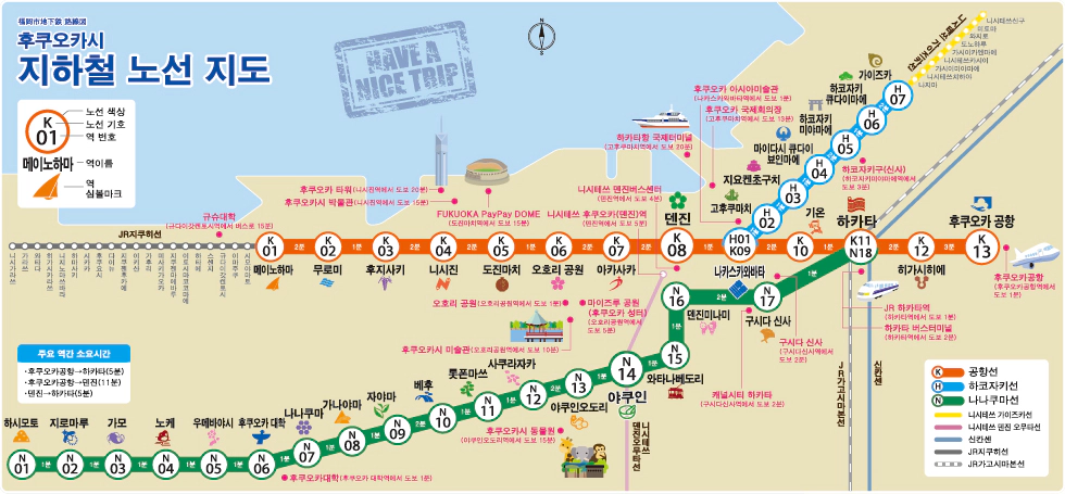 | 구간 | 후쿠오카시 지하철 3개 노선 전체 역 (공항선/하코자키선/나나쿠마선 총 36개 역) |
