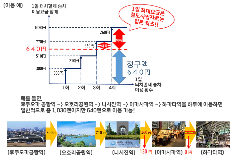 터치결제로 승차할 경우, 1일 지하철 이용요금이 640엔을 넘어가면 지하철 1일권과 동일한 금액인 640엔만 청구되는 서비스에요!