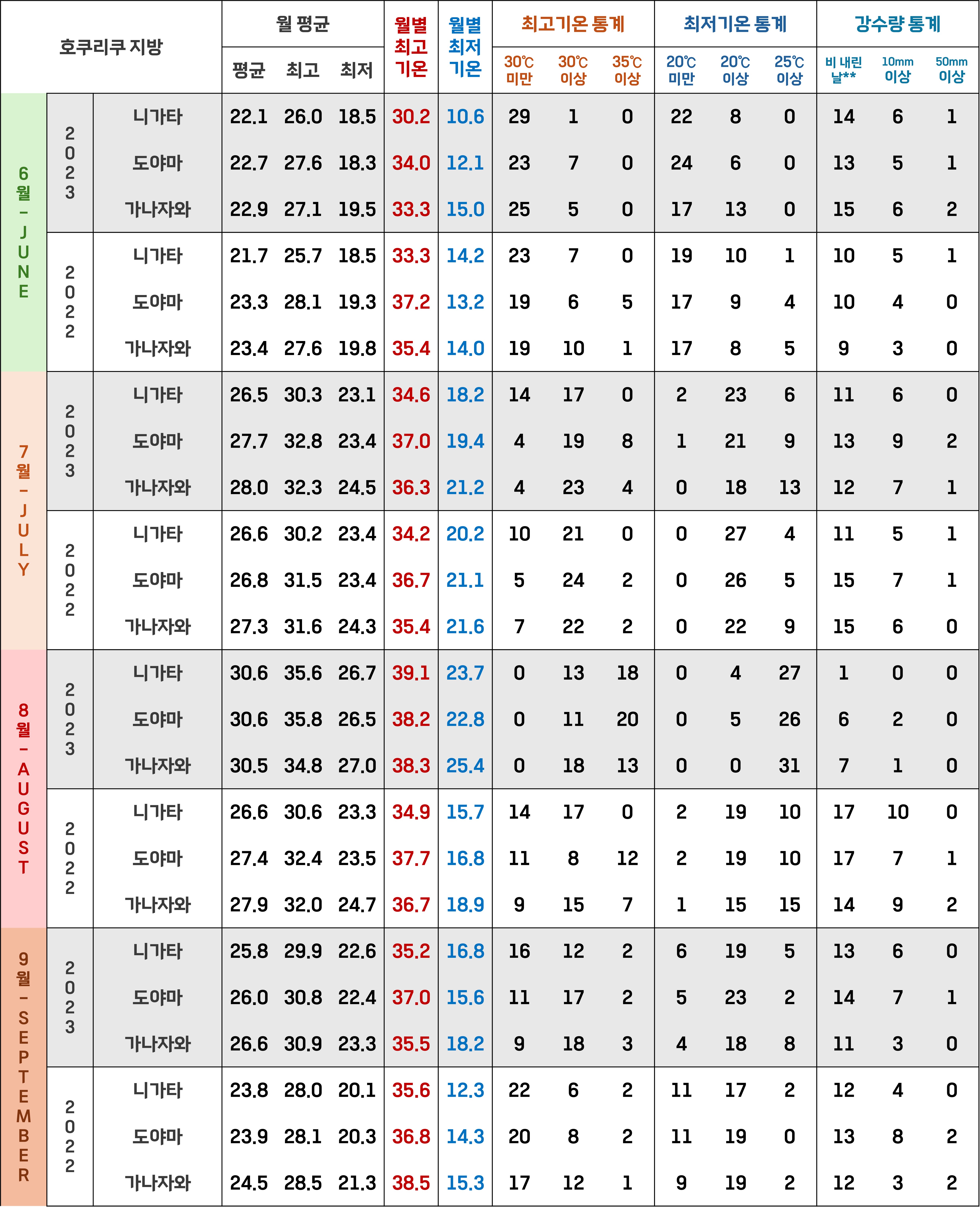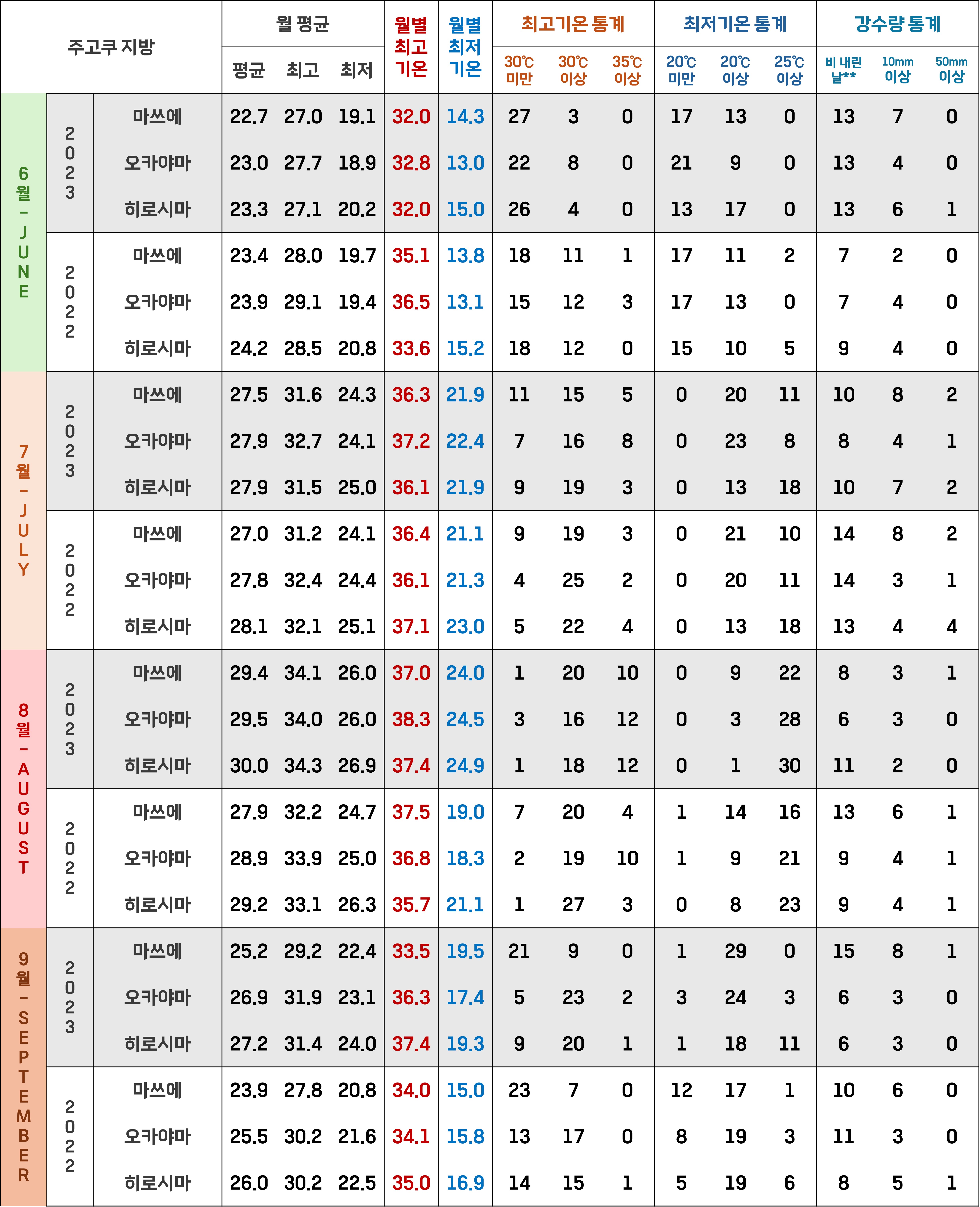 남쪽 지방이라 많이 더울 것 같다는 생각과는 달리, 2022~2023년의 큐슈 남부 및 오키나와 지방은 최고기온으로는 그렇게 높지 않았어요! 2022~2023년의 6~9월을 통틀어 하루 최고기온이 35도를 넘긴 날이 미야자키가 12일 정도로 제일 많았고, 가고시마가 10일 정도였어요.