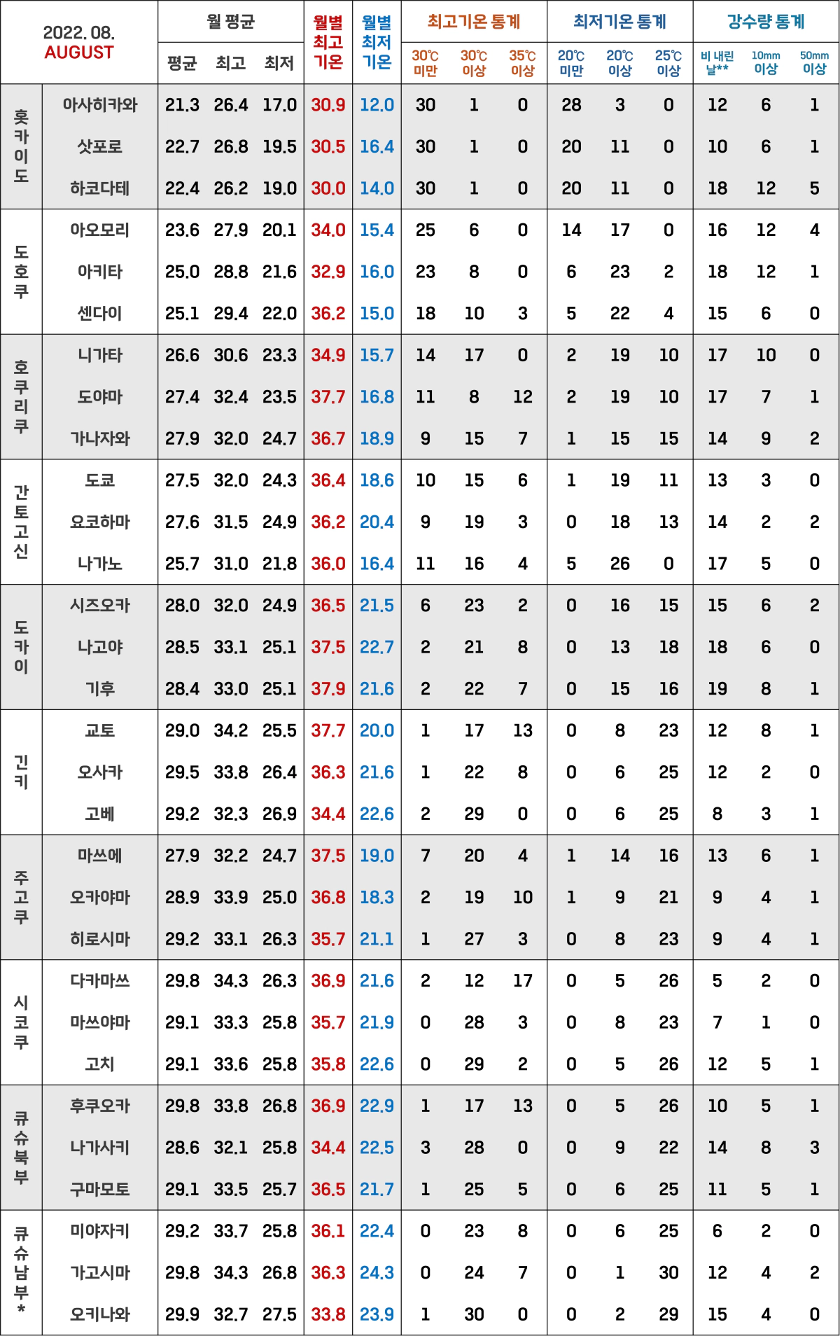 지역은 일본 기상청의 지역 구분을 토대로 '큐슈 남부/아마미 지방'과 '오키나와 지방'을 묶어서 '큐슈 남부/오키나와'로 묶어서 총 10개 지방으로 구분하였고, 각 지방에서 3개 도시를 골라서 총 30개 도시에 대해 분석했어요!