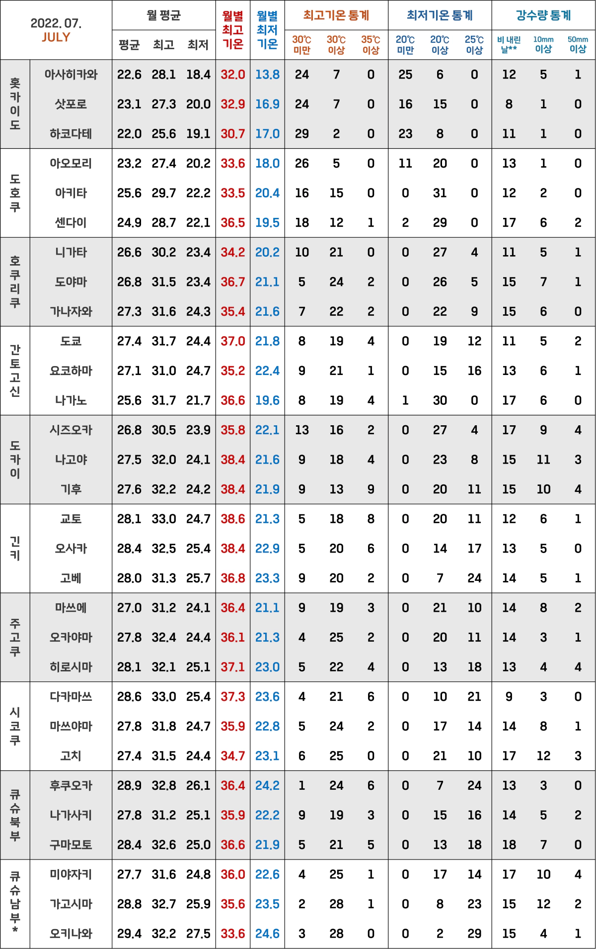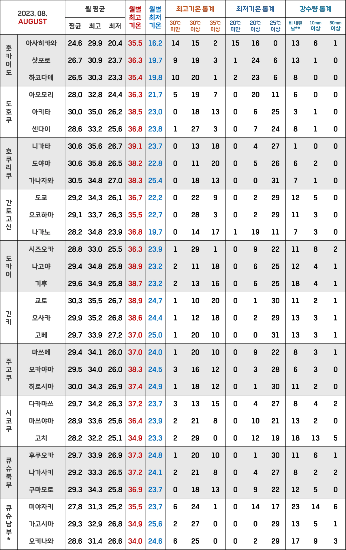 *위에도 적었지만 일본 기상청에서는 주고쿠 지방의 야마구치현을 큐슈북부 지방으로 포함시켜요!