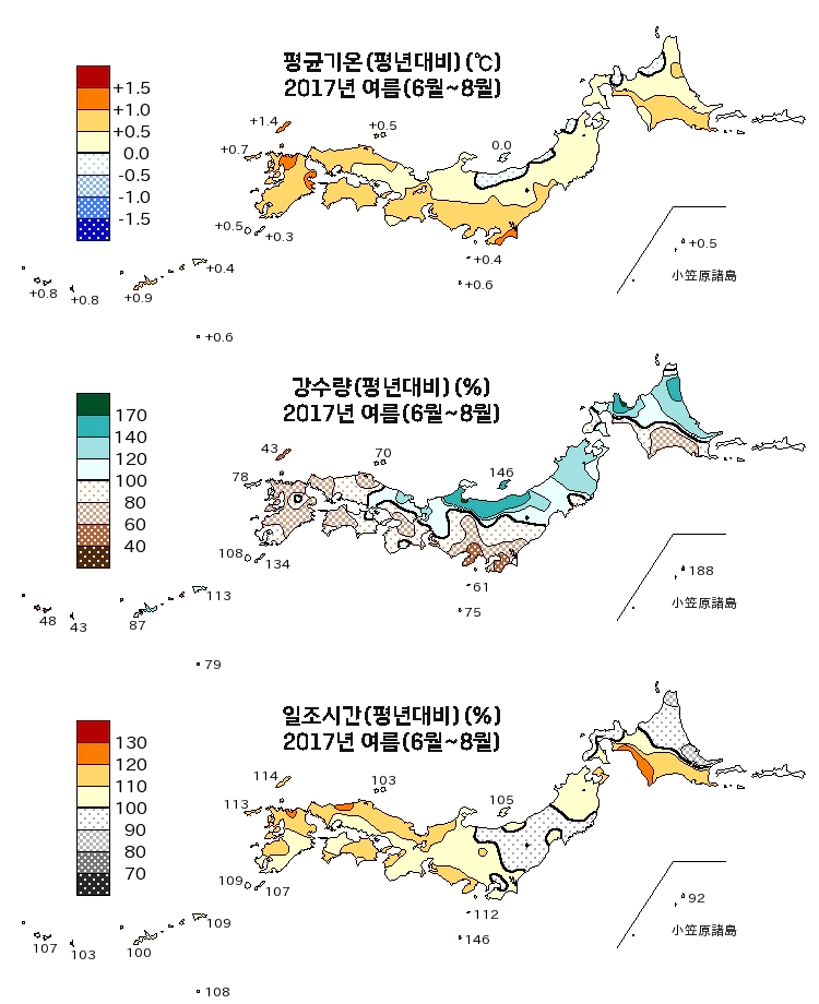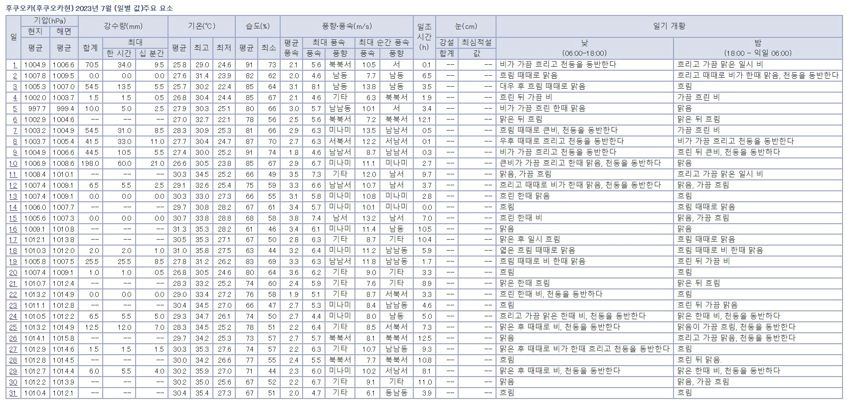 큐슈 남부와 오키나와는 여름철에도 비가 꽤 자주 내리는 것을 볼 수 있는데, 장마(5월 말부터 7월 초중순까지)와 태풍 영향도 함께 받는 것으로 보여요.