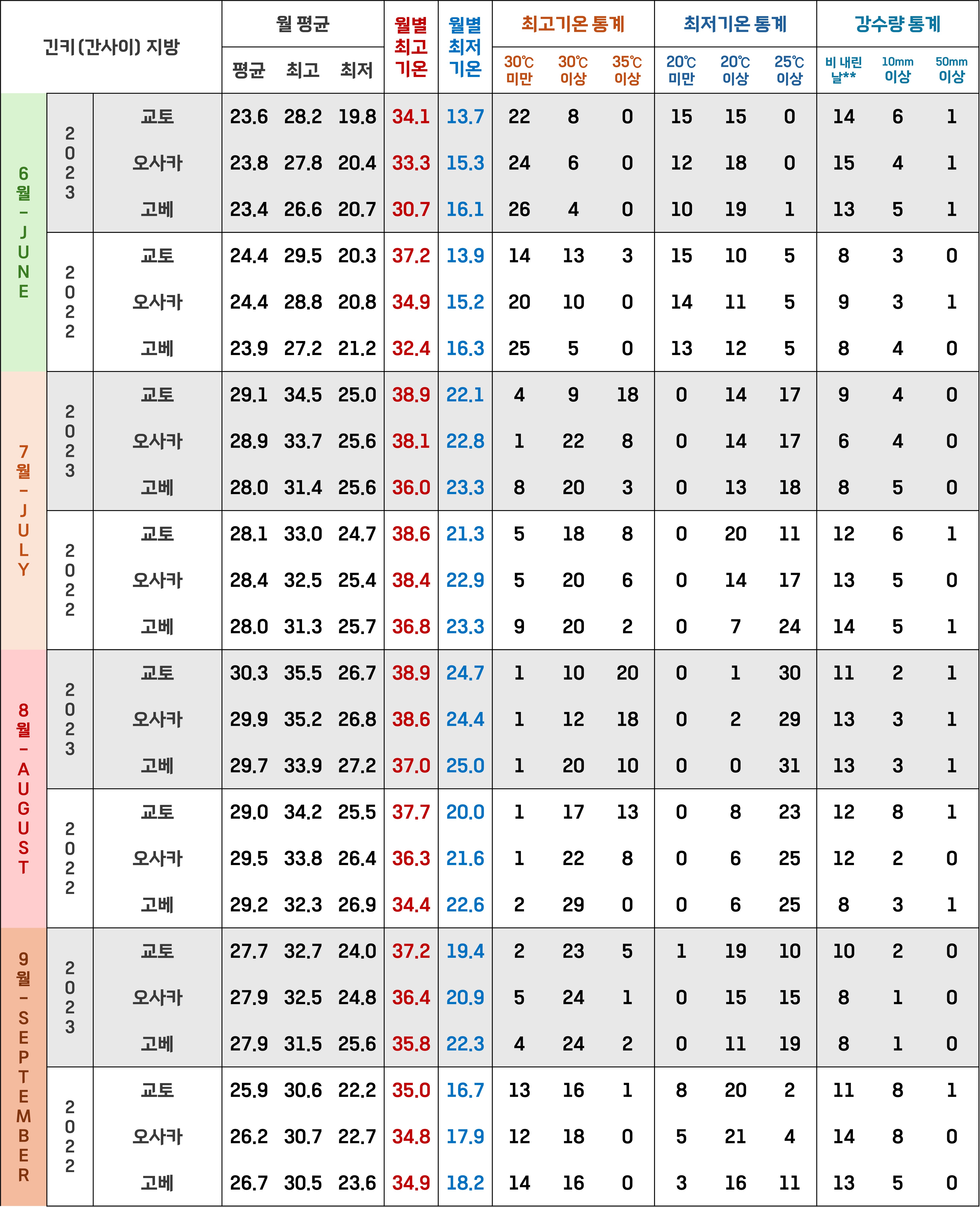 - 하나의 지역 만을 다루는게 아니고 일본 전국의 10개 지역(일본 기상청 기준)에서 각각 3개 도시를 뽑아 총 30개 도시를 분석하다보니 과거 5년 정도도 분석하기에 꽤나 힘이 들어 글을 작성하는 현재 시점에선 과거 2년(2022, 2023년)의 6월~9월의 총 4개월의 데이터를 정리하는 것이 최선이었어요.