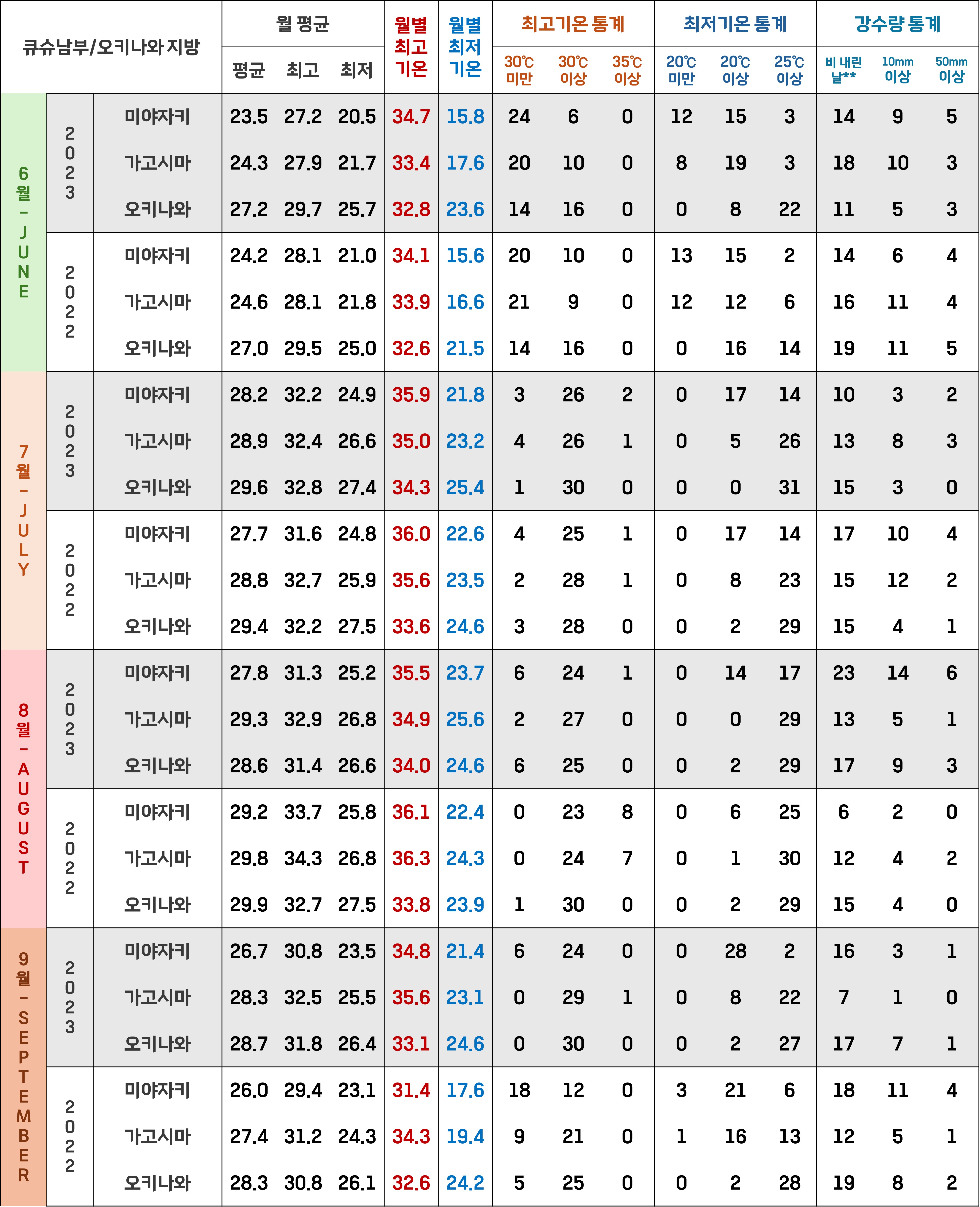 남쪽 지방이라 많이 더울 것 같다는 생각과는 달리, 2022~2023년의 큐슈 남부 및 오키나와 지방은 최고기온으로는 그렇게 높지 않았어요! 2022~2023년의 6~9월을 통틀어 하루 최고기온이 35도를 넘긴 날이 미야자키가 12일 정도로 제일 많았고, 가고시마가 10일 정도였어요.
