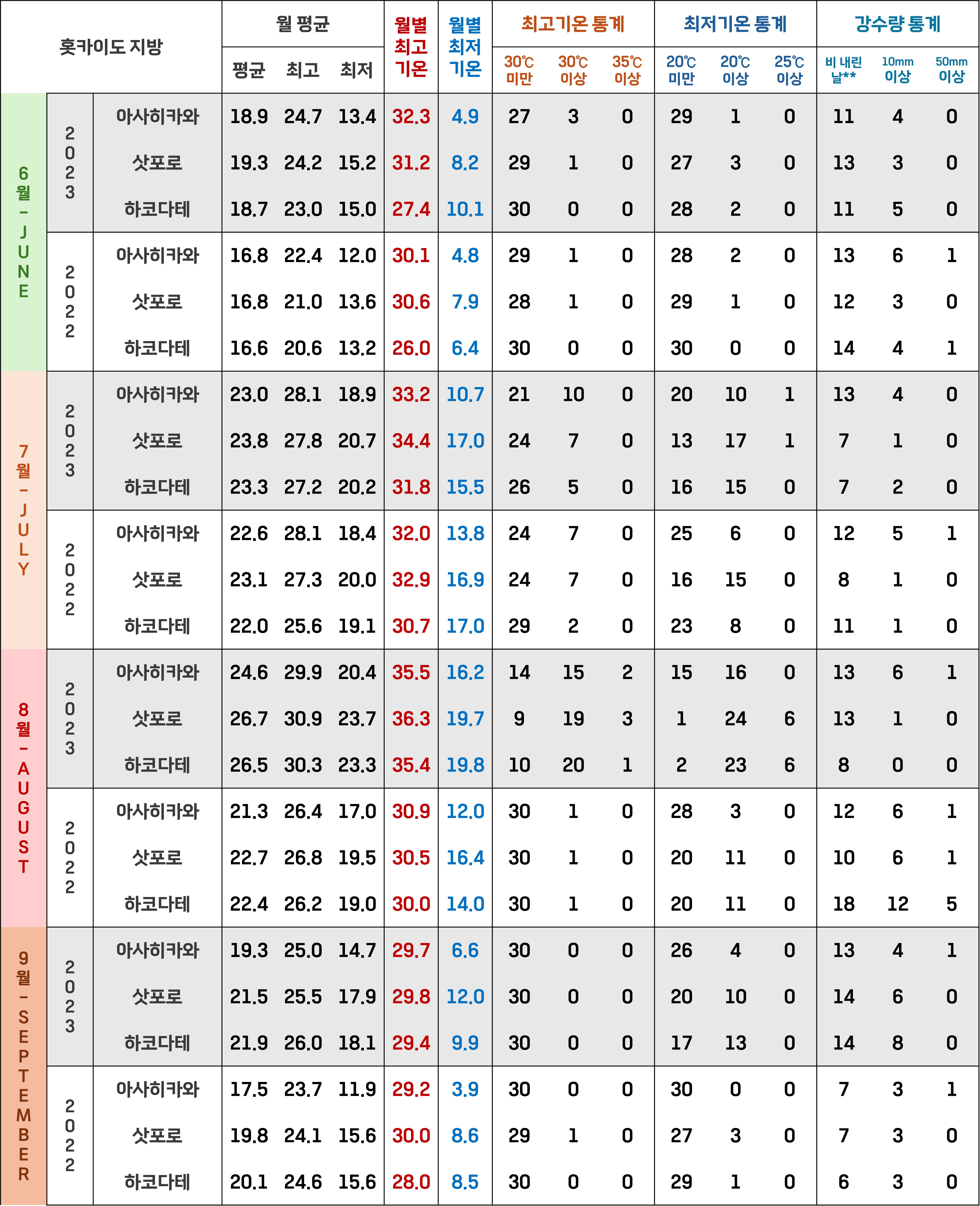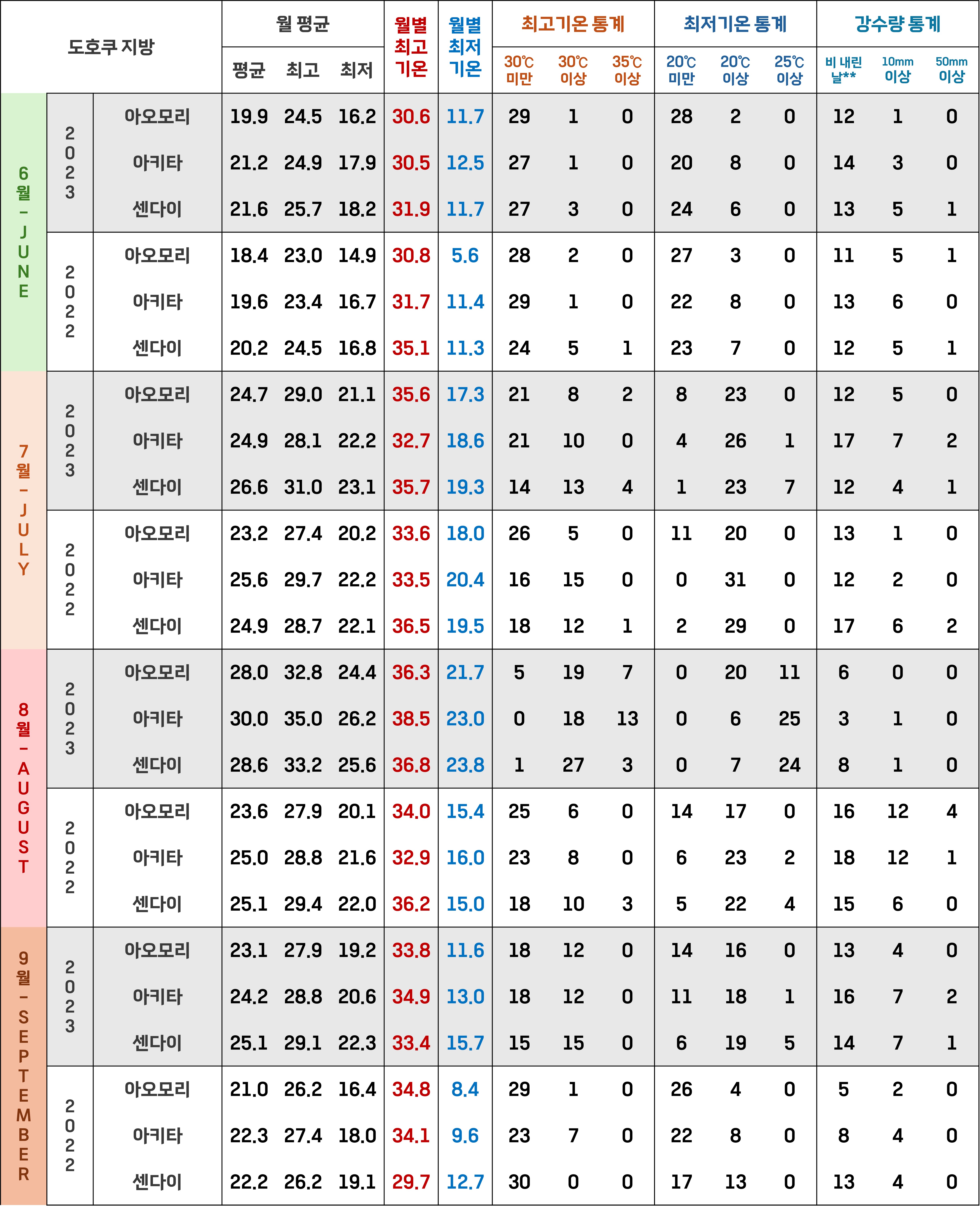 그 외에는 홋카이도는 여름철에도 최고기온이 30도를 밑도는 날이 대부분이에요.