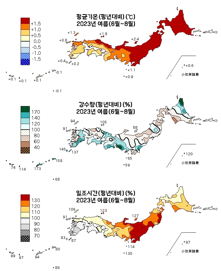 큐슈 남부와 오키나와는 여름철에도 비가 꽤 자주 내리는 것을 볼 수 있는데, 장마(5월 말부터 7월 초중순까지)와 태풍 영향도 함께 받는 것으로 보여요.