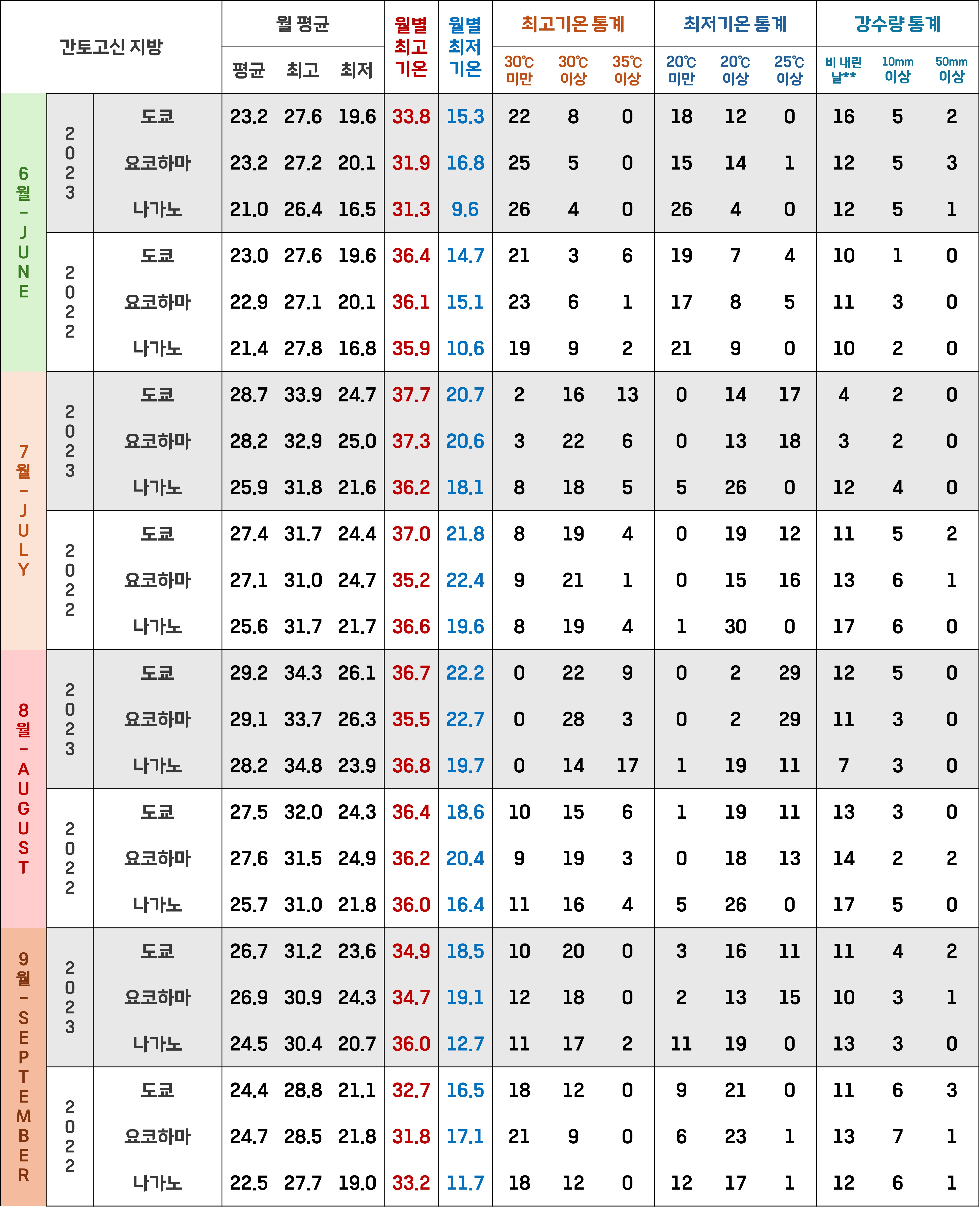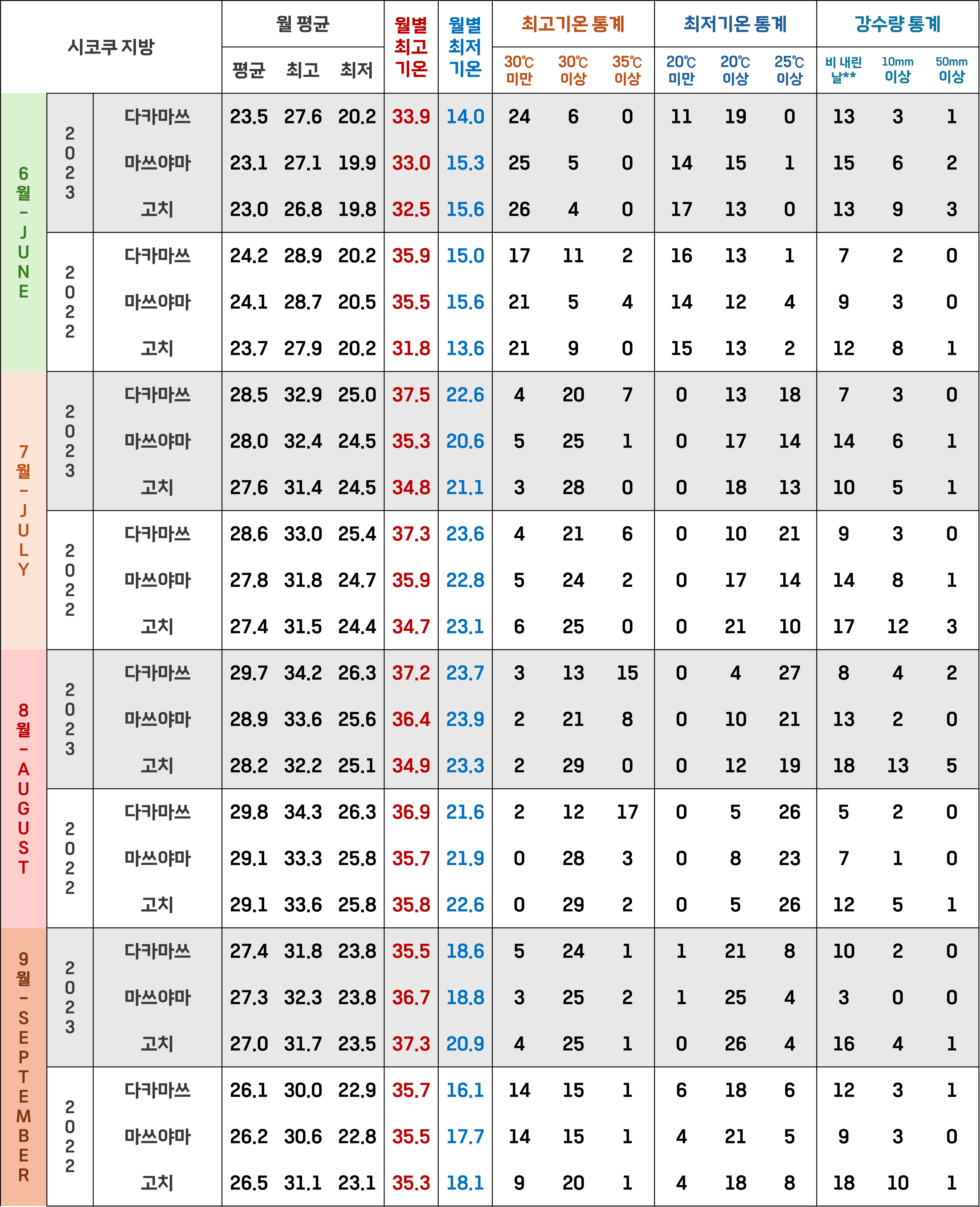 - 하나의 지역 만을 다루는게 아니고 일본 전국의 10개 지역(일본 기상청 기준)에서 각각 3개 도시를 뽑아 총 30개 도시를 분석하다보니 과거 5년 정도도 분석하기에 꽤나 힘이 들어 글을 작성하는 현재 시점에선 과거 2년(2022, 2023년)의 6월~9월의 총 4개월의 데이터를 정리하는 것이 최선이었어요.