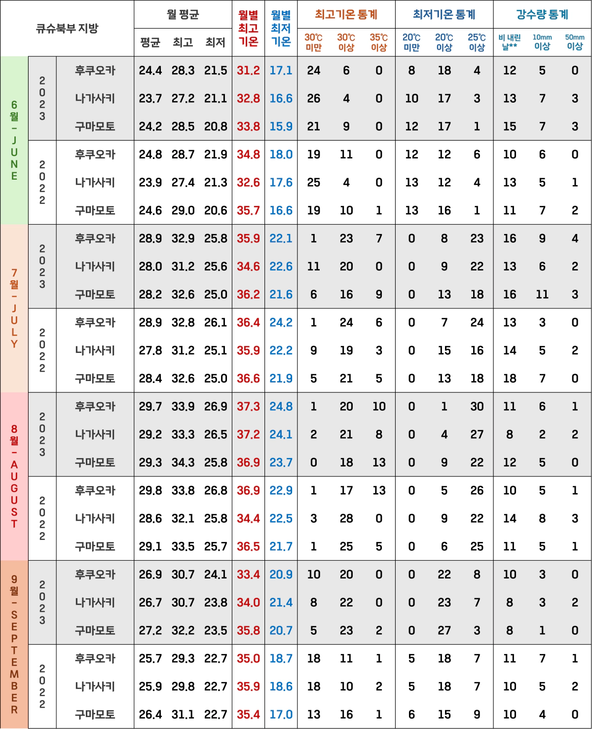 큐슈 남부인 미야자키와 가고시마는 6월과 9월에는 하루 최저기온이 25도를 넘는 날이 며칠 없었지만, 7월과 8월에는 미야자키는 대략 절반에서 2/3정도, 가고시마는 2/3 이상이었어요.
