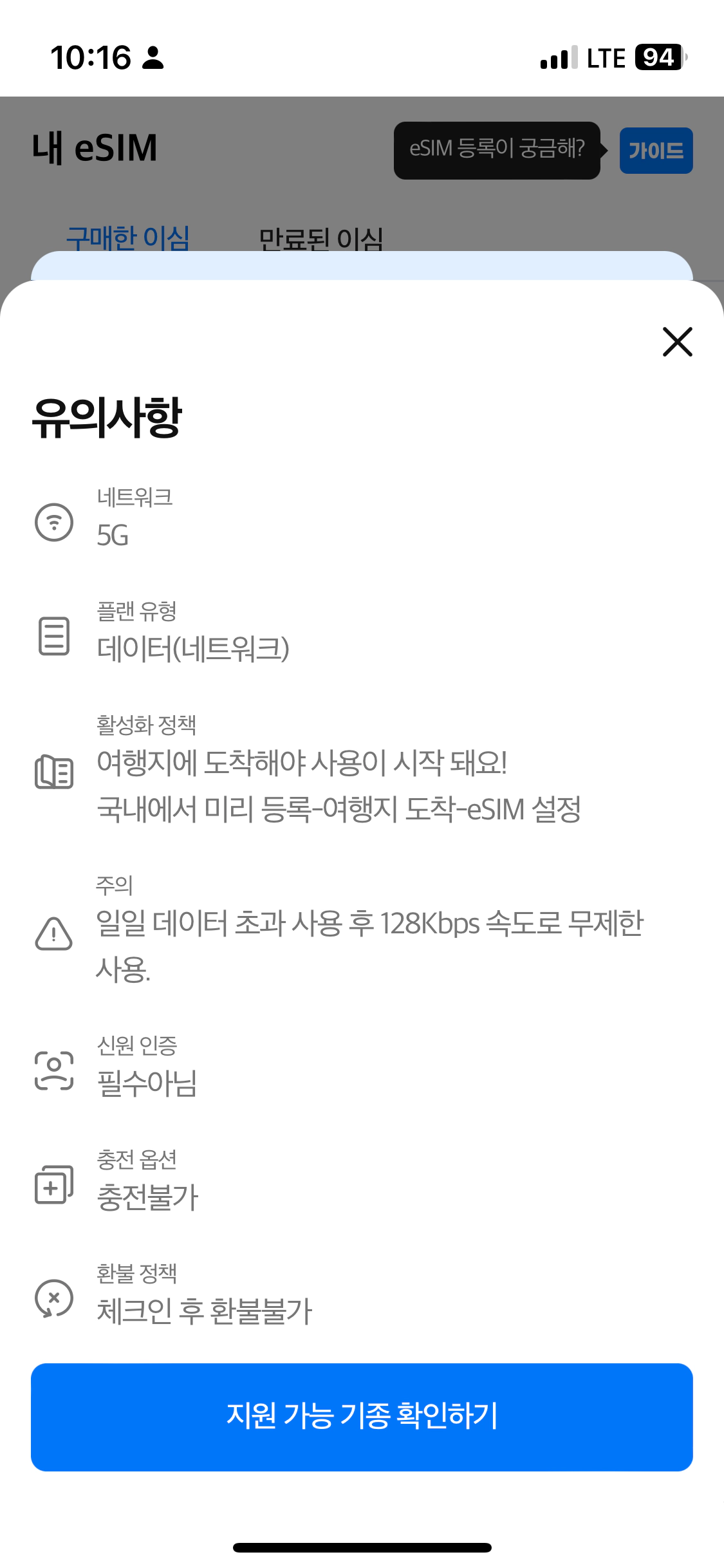 가입도 굳이 전화로 할 필요도 없이 통신사 고객센터 앱에서 가입이 가능하다는 점과 E심 등록, 선불유심 교체, 포켓와이파이 기기처럼 번거로운 점이 없다는 점도 장점이에요.