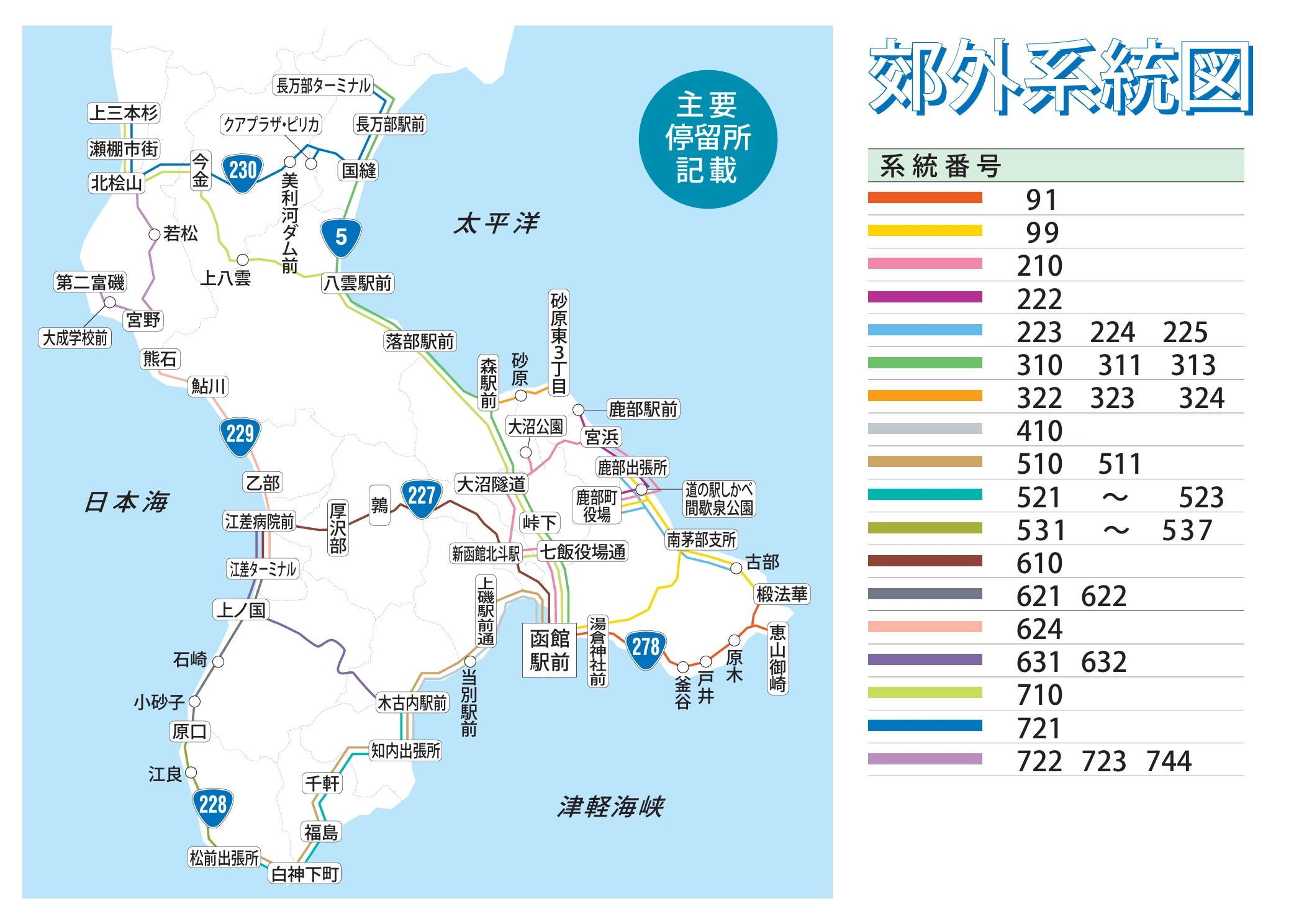 [노선] 시덴스스키노 앞~오도리 버스센터 앞~삿포로역 앞~신하코다테호쿠토역 앞~(중략)~고료카쿠역~하코다테역 앞 터미널~(중략)~유노카와 온천