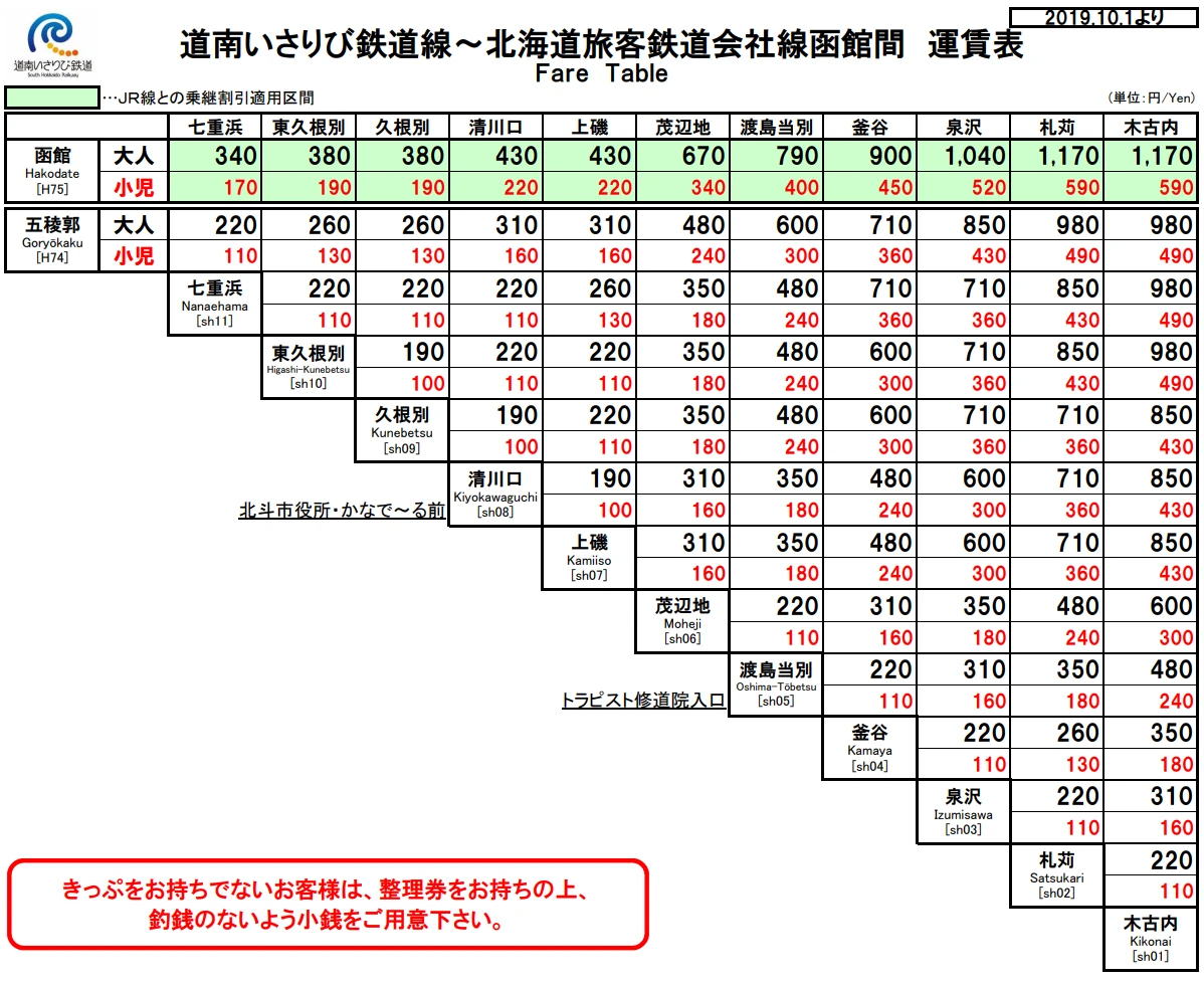 | 교통카드 가능여부 | 불가능 (고료카쿠, 나나에하마, 히가시쿠네베츠, 쿠네베츠, 키요카와구치, 카미이소, 키코나이역의 매표기에선 교통카드로 티켓 구입이 가능해요) |